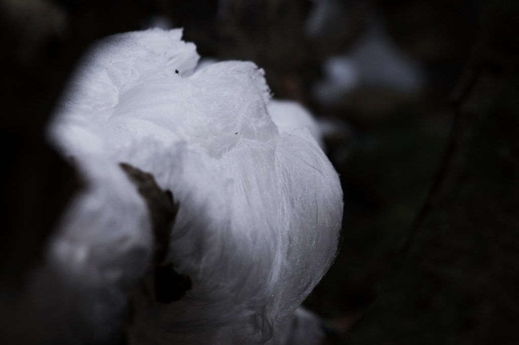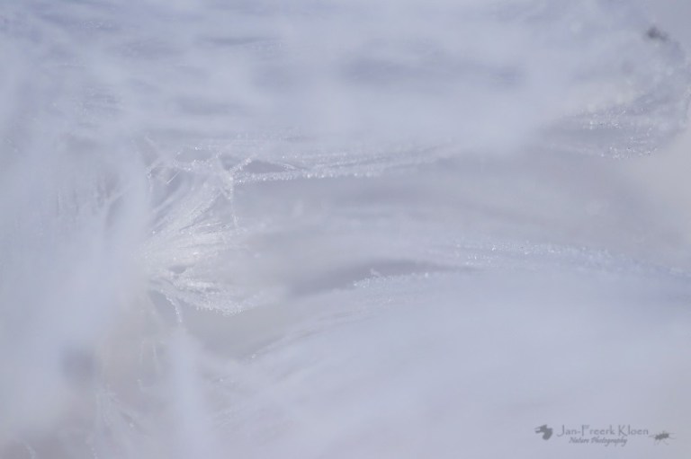 We worden eraan herinnerd dat het bijzonder is als we een nieuw stuk bos in lopen waar we niks meer vinden. En de herinnering dat we al ruim tien kilometer door het gebied gelopen hadden voor we überhaupt ijshaar zagen. En dat ik inmiddels ruim 18 jaar deze wereld onveilig maak zonder het ooit eerder gezien te hebben.