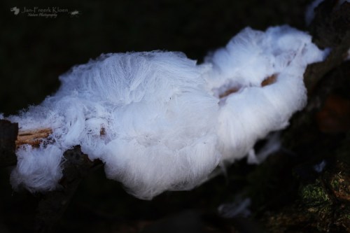 Ongeveer twee kilometer voor we terug zijn bij de parkeerplaats ziet mijn vader toch wat in een omgevallen beuk hangen. En ja, een flinke klont ijshaar! In de schaduw, waar het nog koud genoeg is. En wat is het mooi: allemaal haarfijne ijsstructuurtjes die uit het hout naar buiten komen als een soort baard. De baard van Koning Winter.