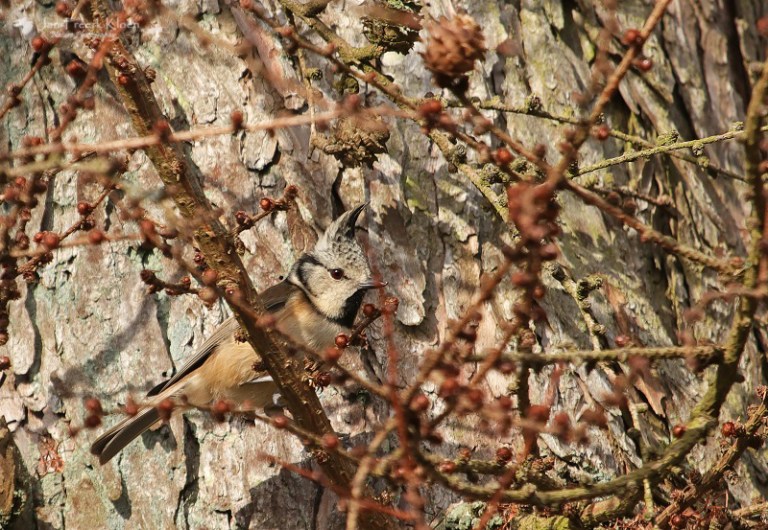 Op het Balloërveld waren ook nog wat vogeltjes te zien en te horen. Vooral de vele boomleeuweriken en veldleeuweriken vielen op. Op grote afstand hoorden we kraanvogels. Gealarmeerd door het geluid draaide ik me om en zag er ver weg twee vliegen, ongeveer één seconde voor ze achter de bomen verdwenen. Op zoek naar de kraanvogels die weer achter de bomen vandaan moesten komen werd ik afgeleid door een overvliegende zeearend die een ommetje boven het veld maakte. Ook leuk!