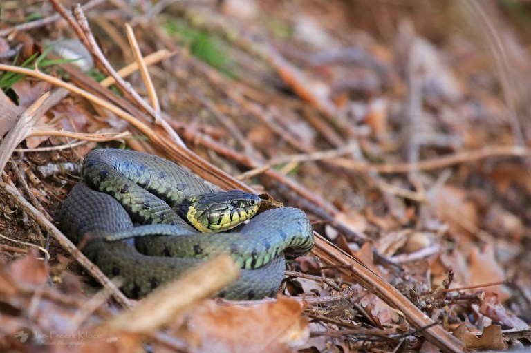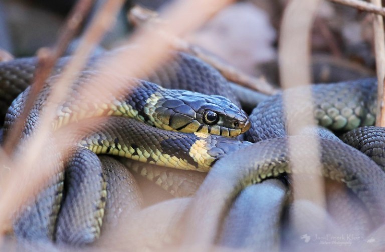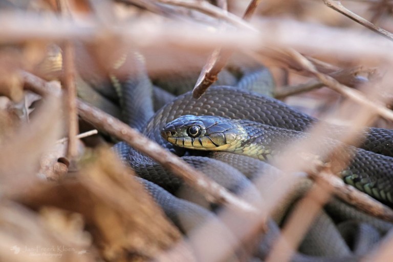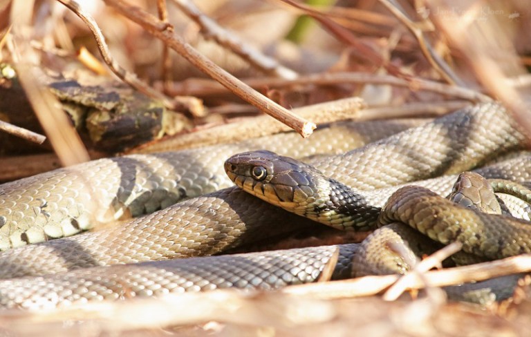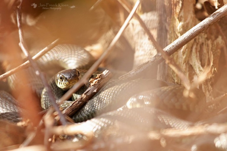 Weer terug in Wageningen had ik dan eindelijk mijn slangen te pakken. Al aan het begin van de middag waren we terug, tijd genoeg dus om nog even te gaan kijken. In de luwte en heerlijk in de zon lagen inderdaad de eerste ringslangen, ondanks dat het maar 10 graden was. Het was niet alsof ik ze over het hoofd had kunnen zien. Een kluwen van twee vrouwtjes met zeven mannetjes eromheen lag onder de braamstruiken te krioelen. Niks rustig opwarmen en voorbereiden op het nieuwe seizoen, maar gelijk voor de seks gaan. Ik heb nog nooit eerder dan half maart parende ringslangen gezien, laat staan in februari. Dit is echt bizar vroeg.