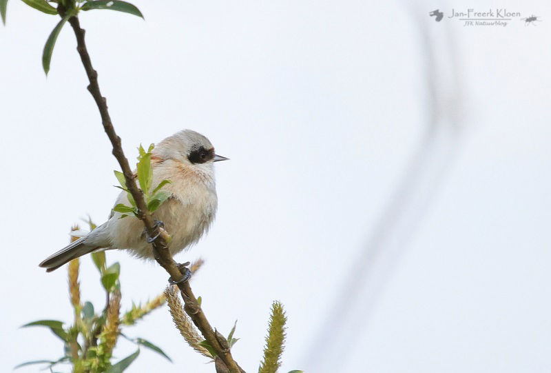 Toch deden we de bijzonderste waarneming niet door eindeloos de horizon af te turen. Die was al heel snel en diep in de beschutting. Niet helemaal zelf gevonden, we hadden een tip gekregen, maar toch nog een uitdaging om de precieze plek te vinden. Een fladderend vogeltje hielp daarbij. Ik dacht in eerste instantie aan een zwartkop, maar de zwarte plek bleek aan de zijkant van de kop te zitten in plaats van erbovenop. Het was het masker van de buidelmees, een vogeltje van het formaat pimpelmees.