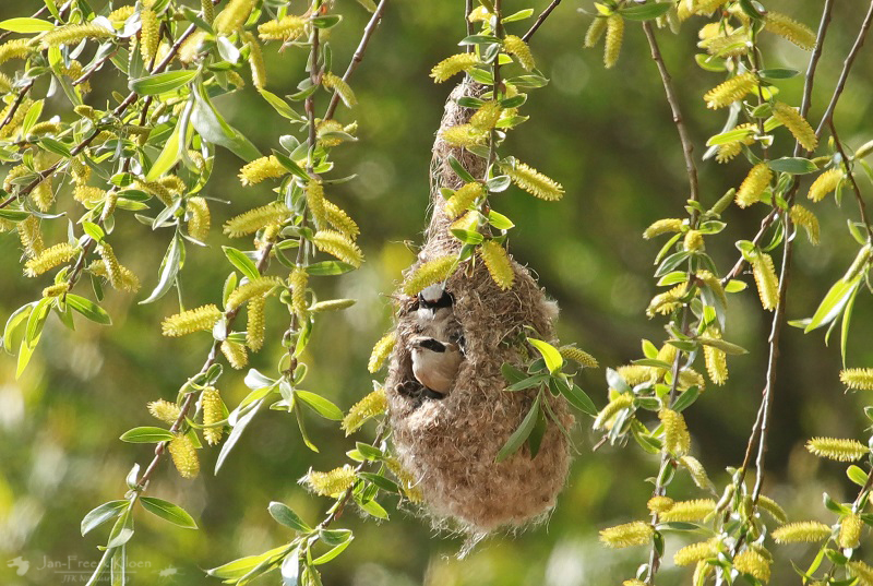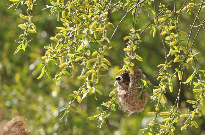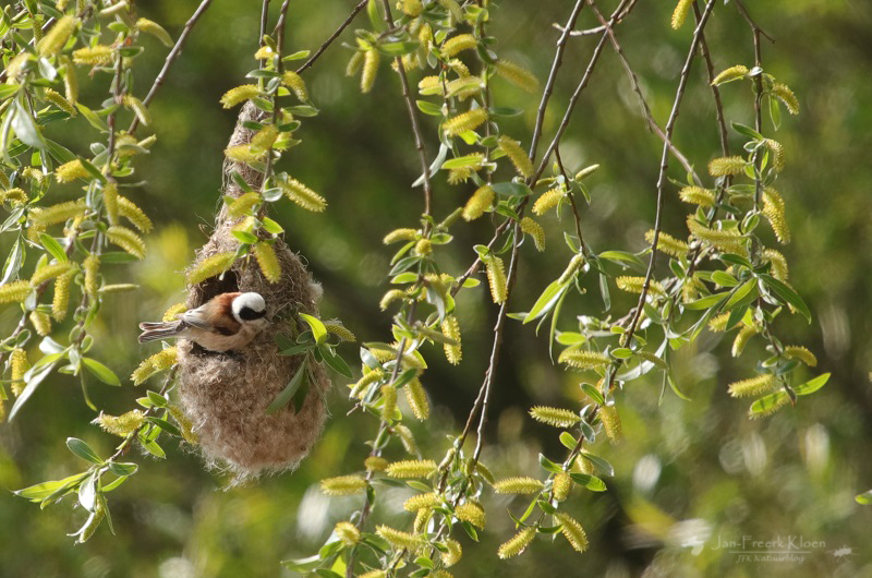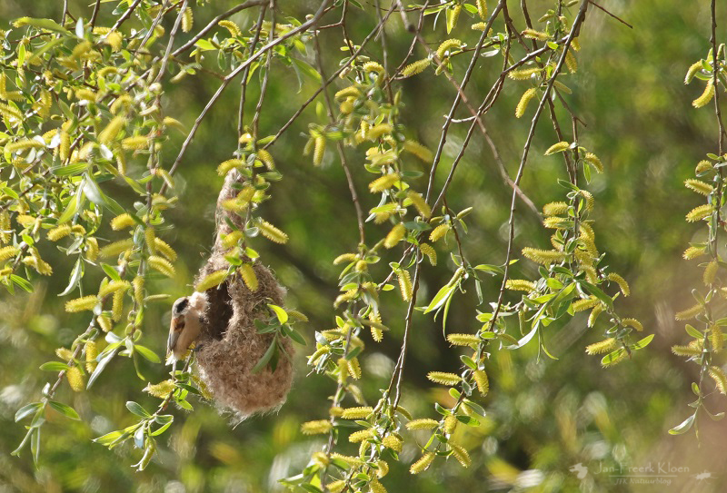 De buidelmees bij zijn bijzondere nest, vakkundig aan de wilgen gehangen.