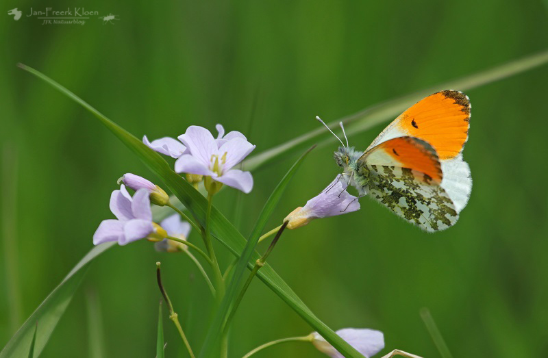 Wat ook niet mag ontbreken bij een voorjaarswandeling is natuurlijk het oranjetipje op een pinksterbloem!