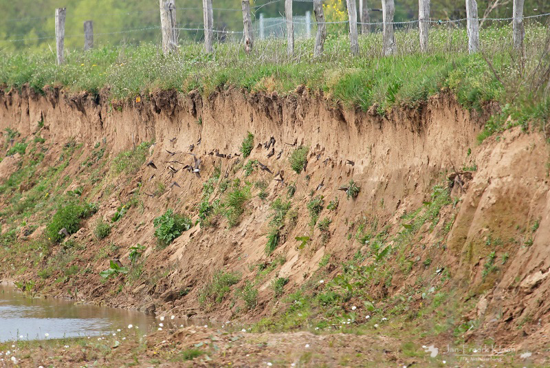 Een flinke zwerm oeverzwaluwen voor een broedwand.