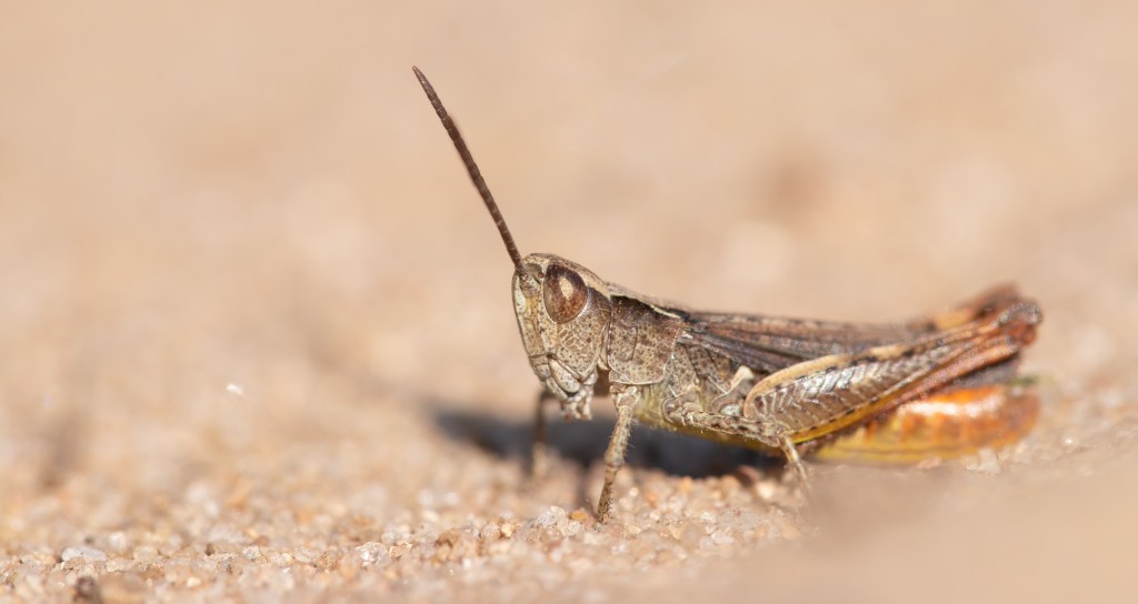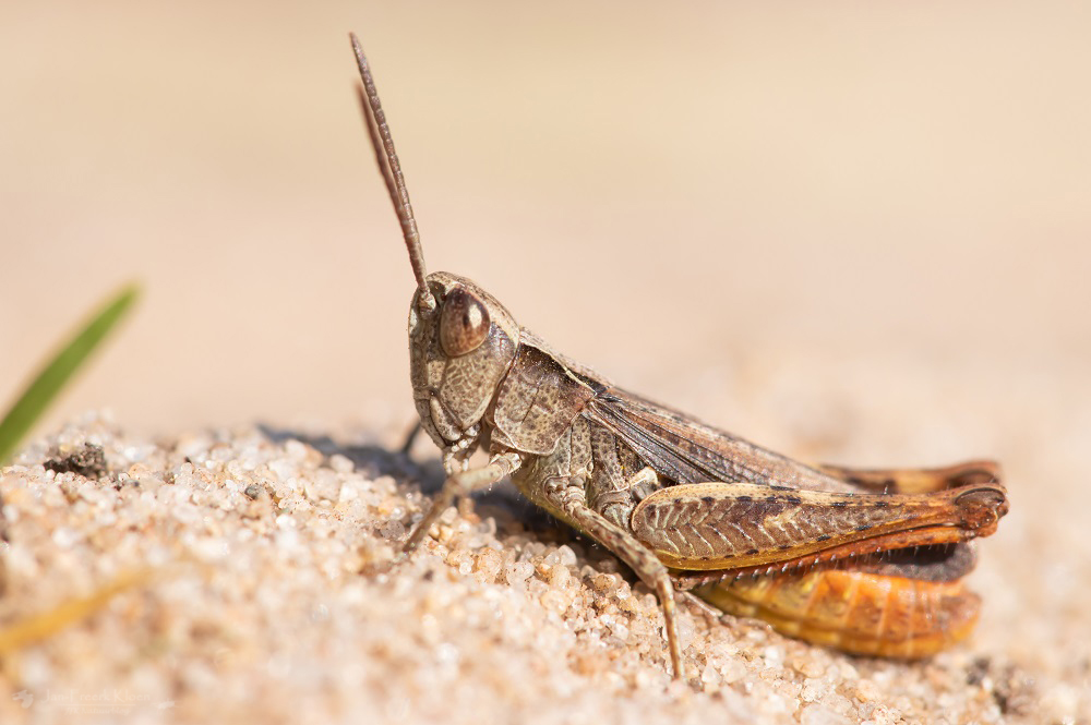 Als goedmakertje vonden we wel een aantal steppesprinkhanen, ook een zeldzame soort die alleen in het Rijk van Nijmegen voorkomt. Deze is nog enigszins te onderscheiden van de rest van de veldsprinkhanen omdat deze een ovale gehooropening heeft en de andere soorten een soort spleet. In de praktijk viel dit kenmerk echter tegen omdat het erg klein is en bovendien vaak achter de vleugel zit. Soms is het net (voor een deel) zichtbaar. Gelukkig maken ze ook geluid en had ik van tevoren wel eventjes geoefend. Toen ik een beestje gevonden had waarvan ik dacht dat het hem was bevestigde hij dat zelf met zijn zachte zang.