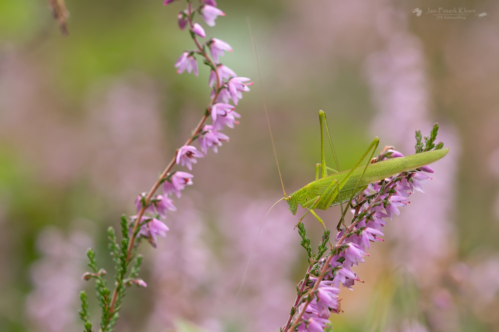 Een ander beestje uit dezelfde categorie is de sikkelsprinkhaan. Deze knalgroene en extreem langwerpige middelgrote sprinkhaan bevolkt inmiddels heel wat heidevelden en graslanden, terwijl hij niet zo lang geleden alleen in het zuidoosten des lands gevonden werd. Inmiddels heb ik hem op bijna elk willekeurig heideveld in onze omgeving al gezien. Met zijn libelachtige vlucht word je misschien eerst op het verkeerde been gezet, maar als blijkt dat hij na een flinke sprong tegen een grassprietje aan vliegt en je niet zo’n groene libel in je boekje kunt vinden weet je hem wel.