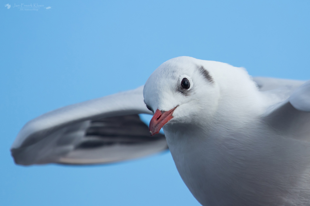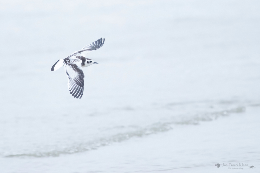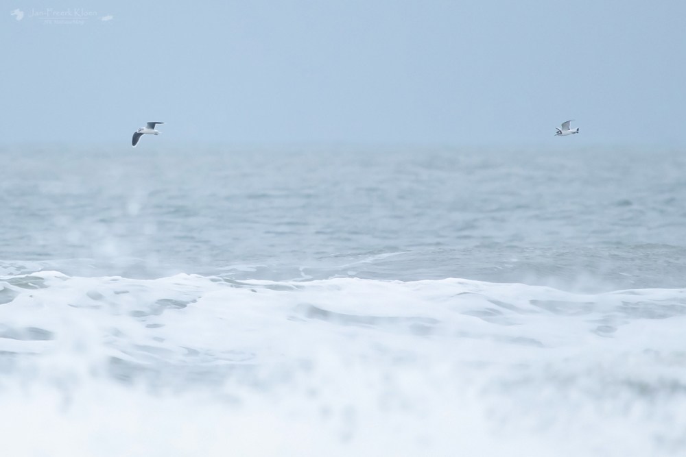 Dit tafereel herhaalde zich even later, maar nu was ik aan de beurt om te bellen. Aan het eind van de branding kwamen twee dwergmeeuwen aanvliegen. Met mijn telefoon in mijn hand stond ik daar, toen één van de twee, een juveniele dwergmeeuw besloot om recht op mij af te komen. Op amper tien meter van mij vandaan draaide hij een rondje over het strand. Daar stond ik dan, met mijn telefoon tussen mijn schouder en mijn oor geklemd zo goed en zo kwaad als het ging het beest op de foto te zetten. Gelukt! Mijn ouders konden hem vanaf waar ze stonden helaas niet vinden.