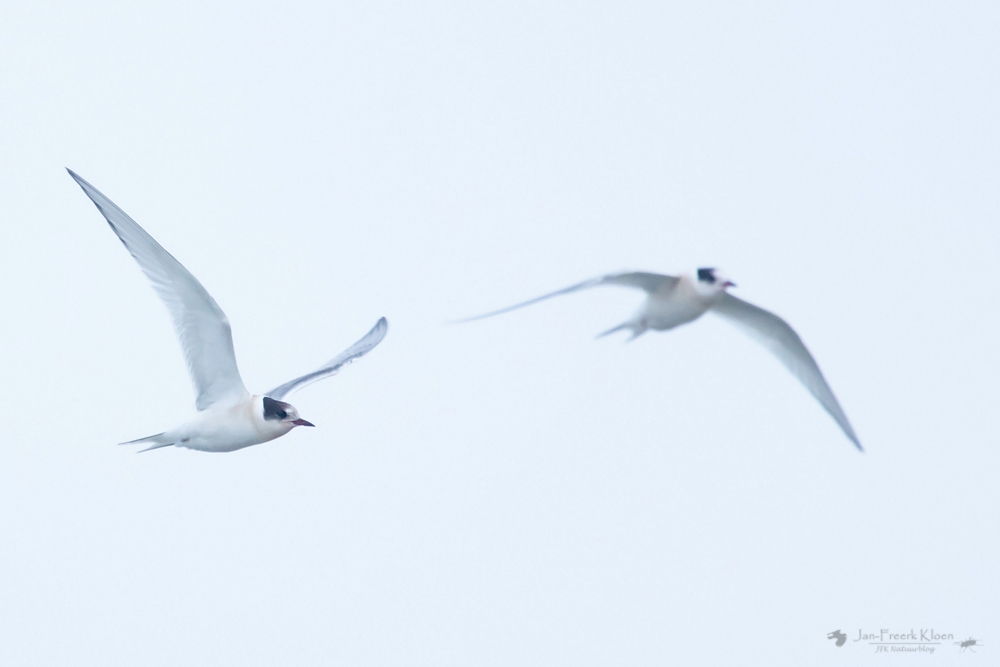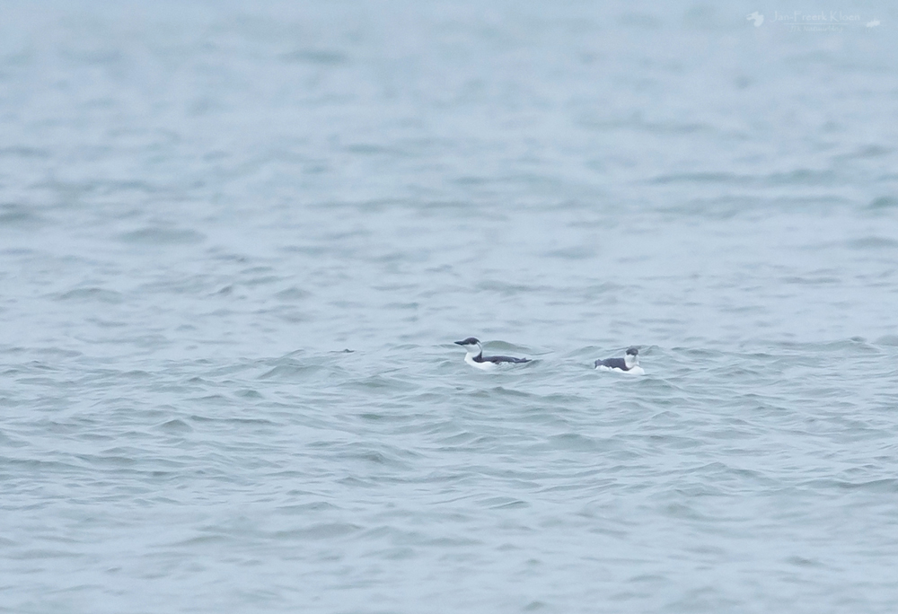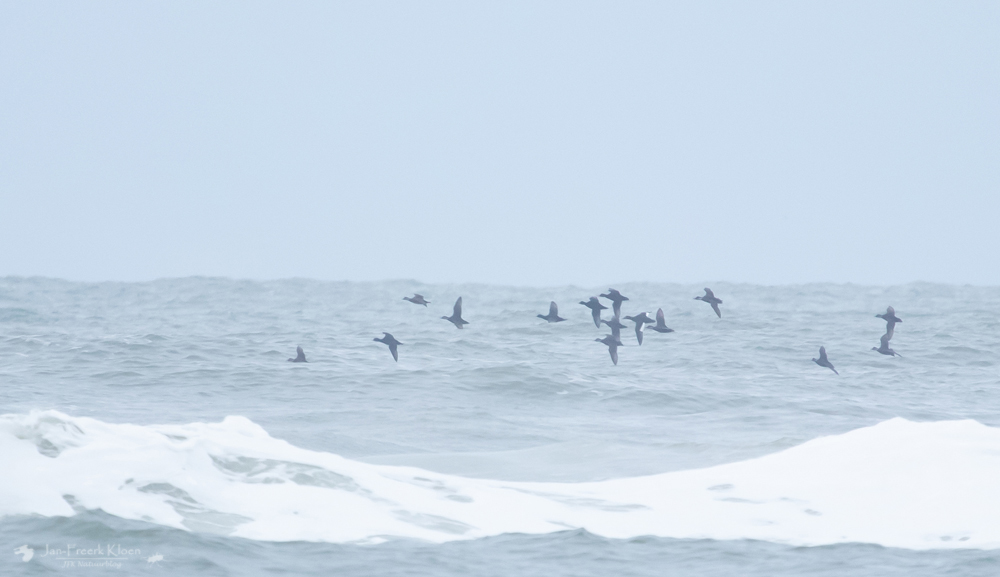 Op zee vlogen intussen ook zeekoeten voorbij. Vlak achter de branding hingen veel zwarte zee-eenden rond. Er zat ook een grote zee-eend tussen, bleek toen ik ’s avonds de foto’s ging bekijken. In een groep opvliegende zee-eenden knalde er eentje uit dankzij een opvallend wit blok in de vleugels.