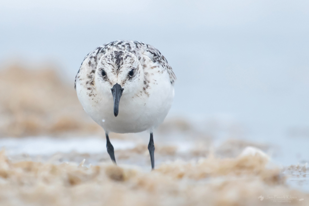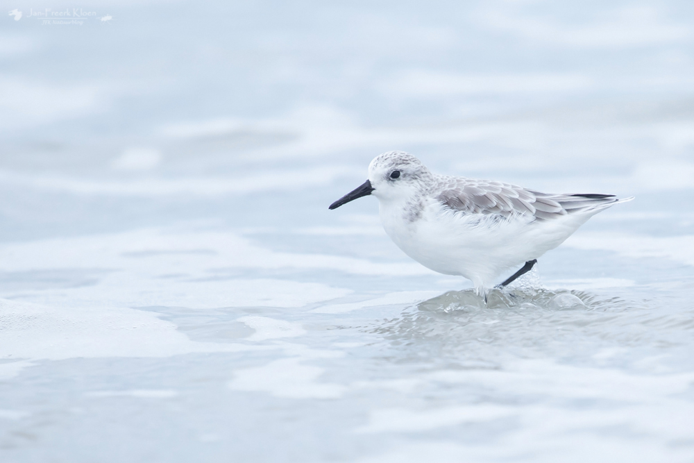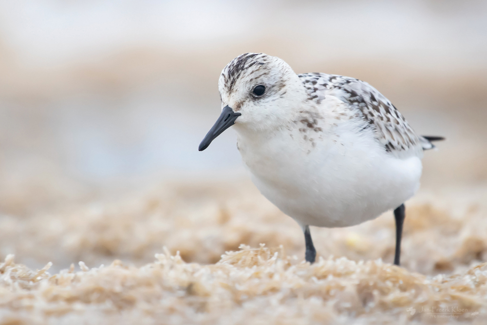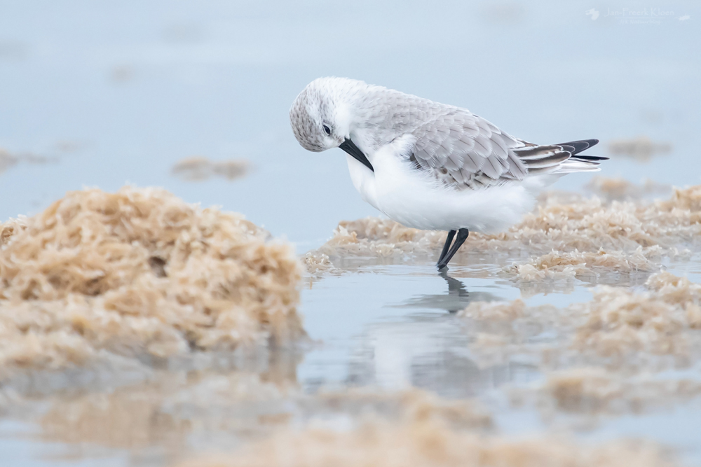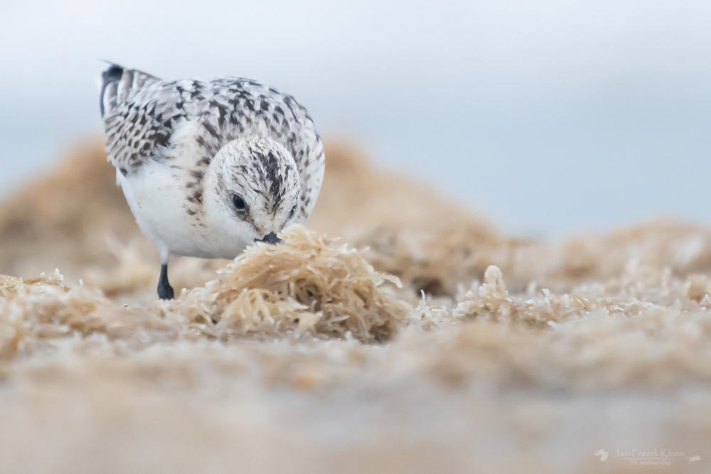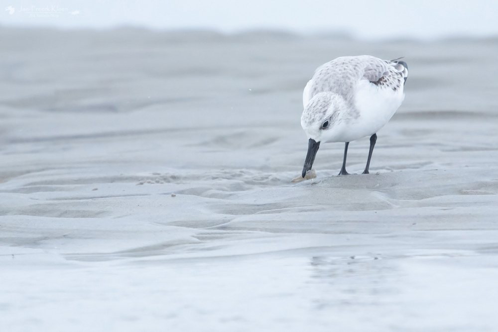 Op zaterdag zagen we de eerste echte zeevogels. We gingen wandelen op het noordzeestrand tussen Nes en Ballum. Zonder telescoop, dus we moesten het met verrekijkers en mijn telelens doen. Weliswaar was de wind al wat gedraaid en was het daardoor minder gunstig om zeevogels te zien, maar al heel snel had ik een parelduiker in het vizier, enorm ver weg boven zee. Een aantal minuten later gevolgd door een vijftal Jan-van-genten, eveneens zo ver weg dat er amper wat van te maken was. Gelukkig was er ook dichterbij al wat te zien: namelijk drieteenstrandlopers. Zeker niet zeldzaam, maar wel heel leuk om naar te kijken. Ze lopen met de golven mee, om net aangespoelde beestjes op te kunnen pikken. Bovendien zijn ze aardig aan mensen gewend, waardoor ze ook voor de fotograaf een erg fijn doelwit zijn.