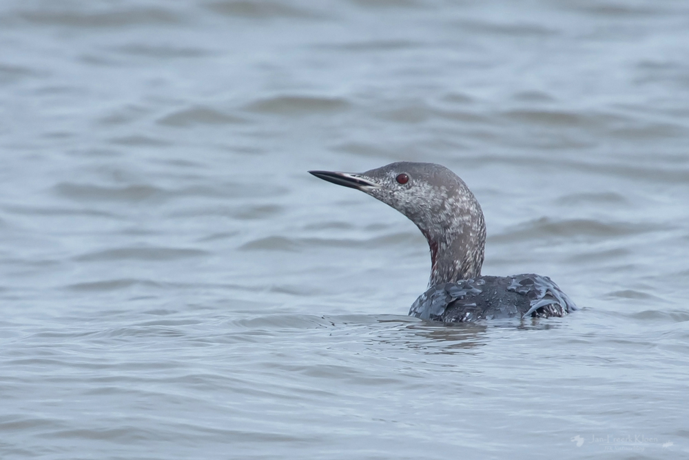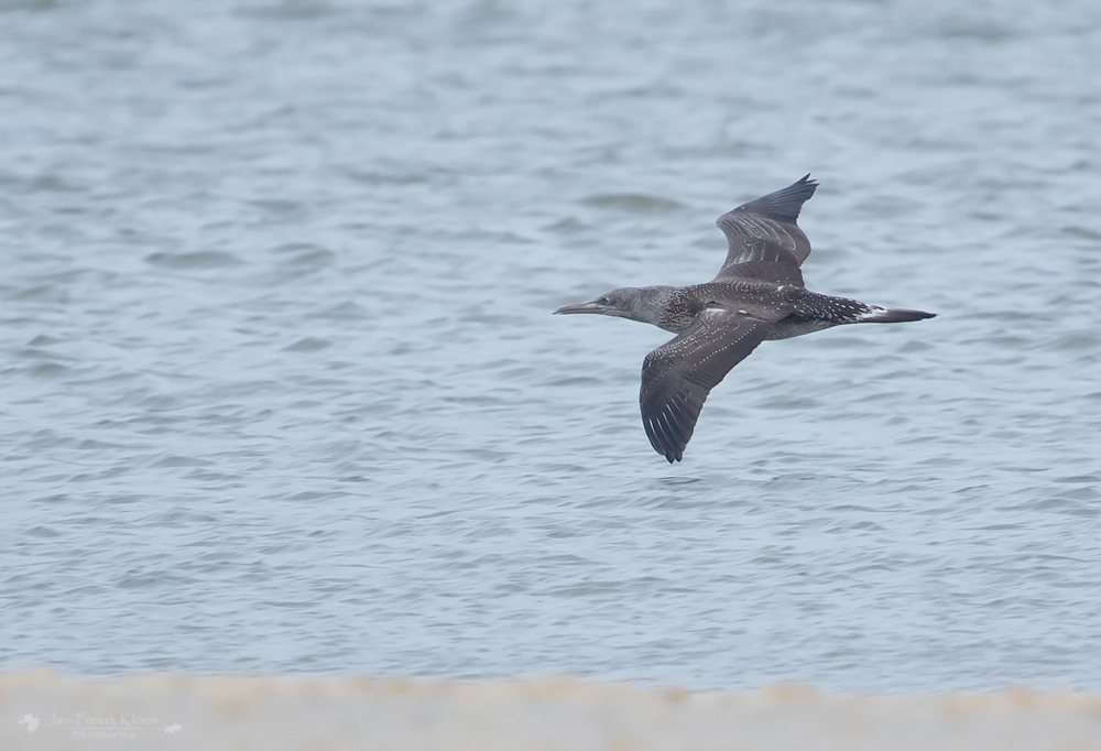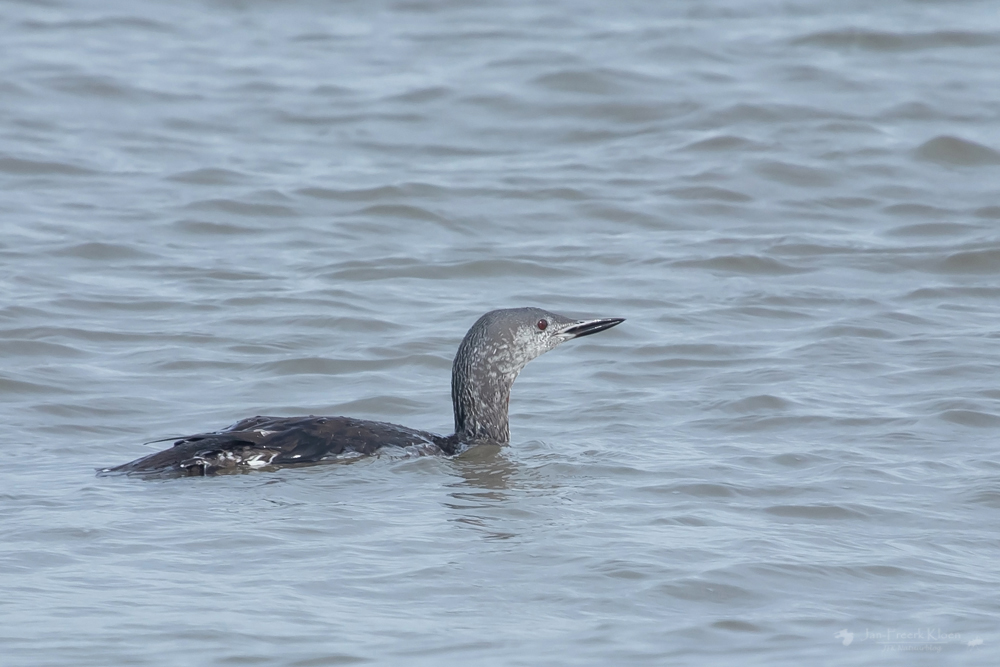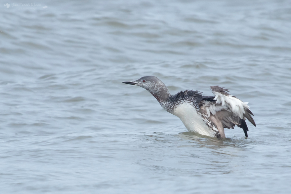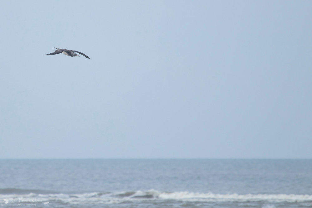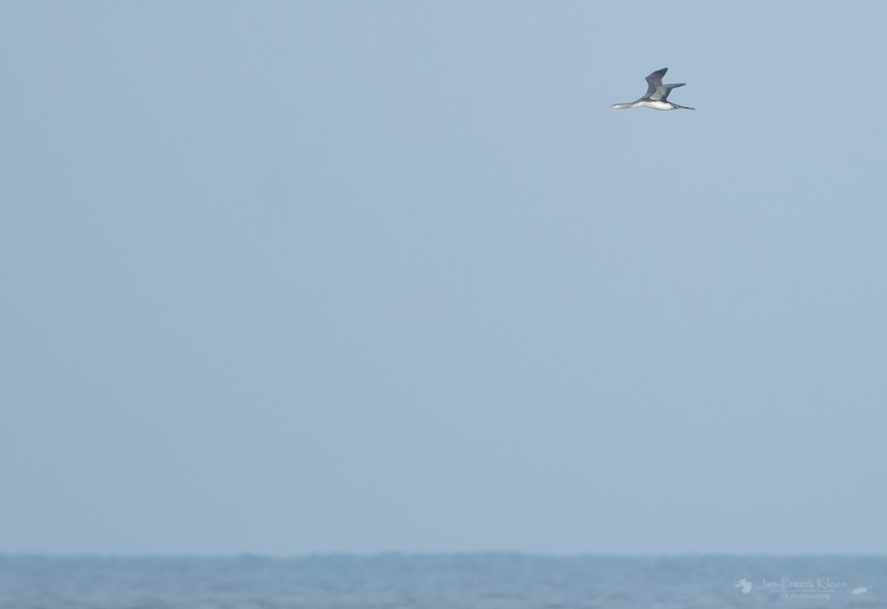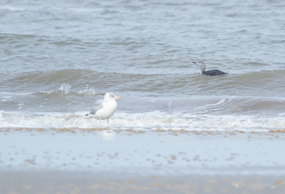 Ondanks de zuidenwind (aflandige wind aan het noordzeestrand) werd het een mooi zeevogeldagje. Binnen een mum van tijd zagen we al de eerste roodkeelduikers en zeekoeten vliegen, niet veel later door een paar Jan-van-genten op gigantische afstand. Maar de mooiste roodkeelduiker kwam halverwege de wandeling naar de oostpunt, toen ik een roodkeelduiker ontdekte die pal achter de eerste golf dobberde, op een meter of vijf van het strand. Terwijl ik in die richting liep zwom hij wel iets naar achter, maar niet veel en dus kon ik hem van dichtbij bekijken! De vogel was nog niet in winterkleed, maar in de overgang. Een deel van de rode keel was nog zichtbaar en de kop was grijs-wit gevlekt.