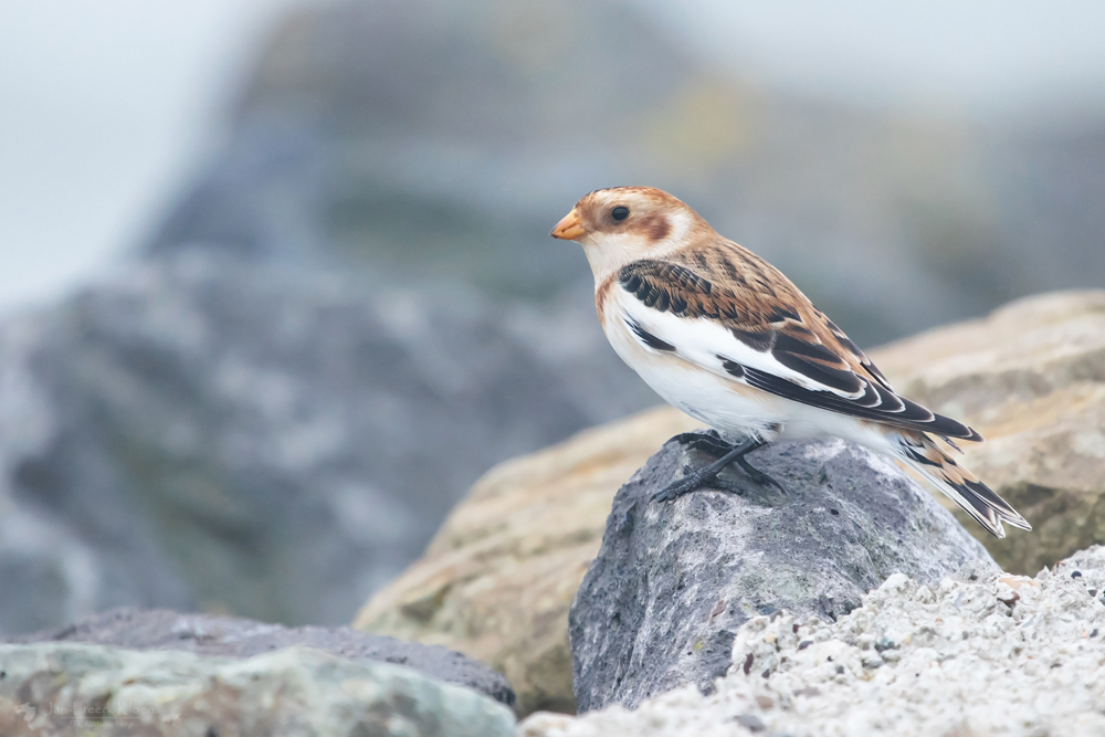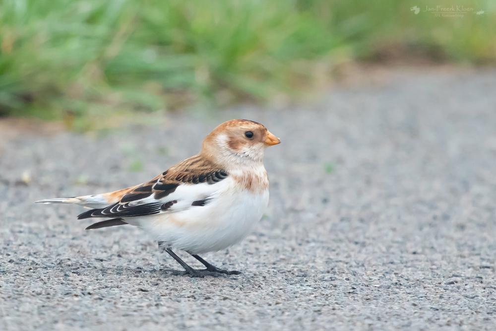 Dinsdag was onze laatste dag op het eiland. Om het hele eiland gezien te hebben fietsten we via de vuurtoren aan de westkant naar de boot. Het was mistig en het miezerde een beetje. Niet bepaald ideaal weer om nog leuke vogels te zien. Toch troffen we op de waddendijk nog een leuk vogeltje. Er liep een sneeuwgors over het fietspad. Hij liet zich erg leuk zien en fotograferen.
