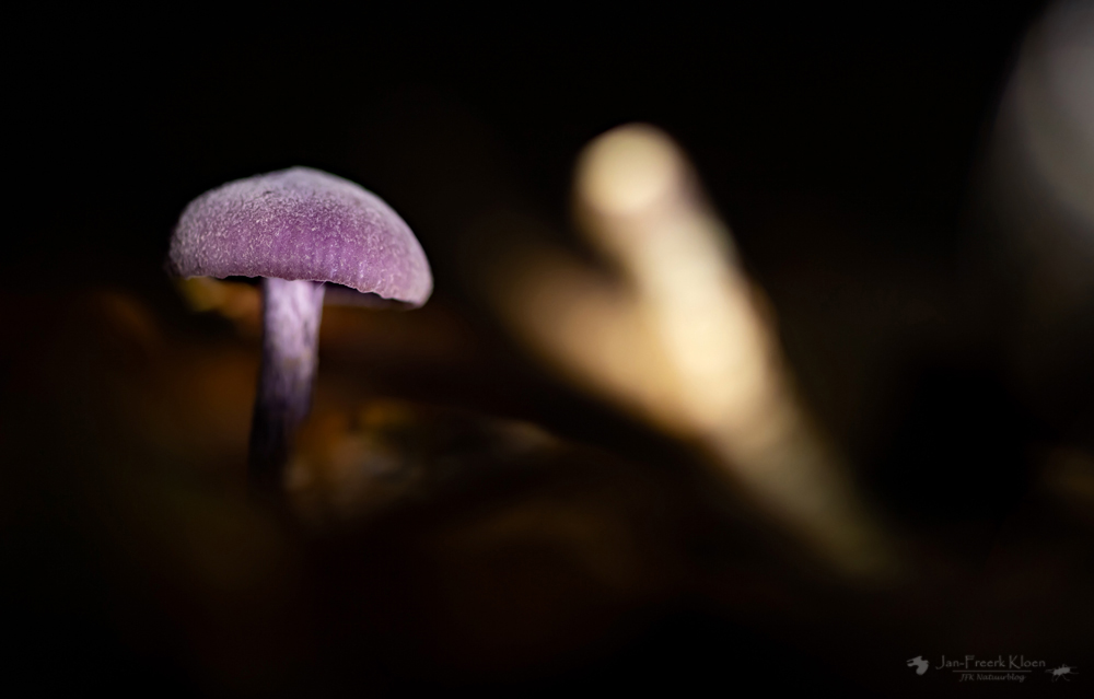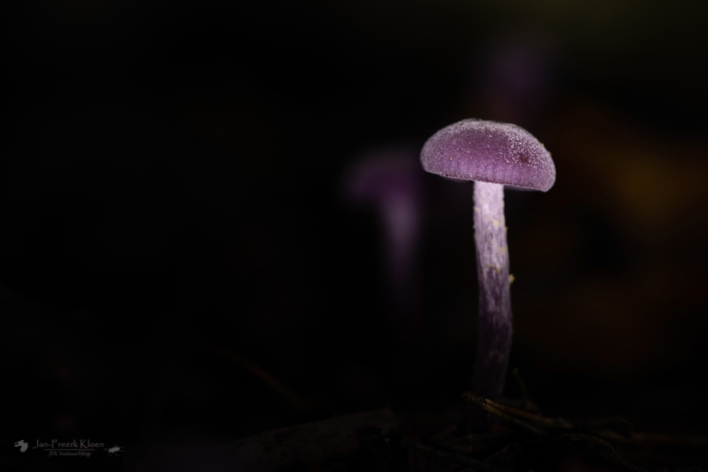 Een andere tak van sport is paddenstoeltjes fotograferen in het (half)donker. Met lichtjes van voren, achteren of opzij kan je geweldige effecten creëren om je foto een magisch tintje te geven. Met een spotje van voren krijg je een compleet donkere foto waaruit een paddenstoeltje verrijst, met tegenlicht krijg je de haarscherpe tegenlichtrandjes in een donkere foto. Belicht je het hele beeld (met een ringflitser), dan gebeurt er eigenlijk niets bijzonders. De paddenstoel staat mooi en duidelijk op de foto in zijn omgeving. Mooi? Zeker! Heel speciaal? Nee, wat mij betreft niet.