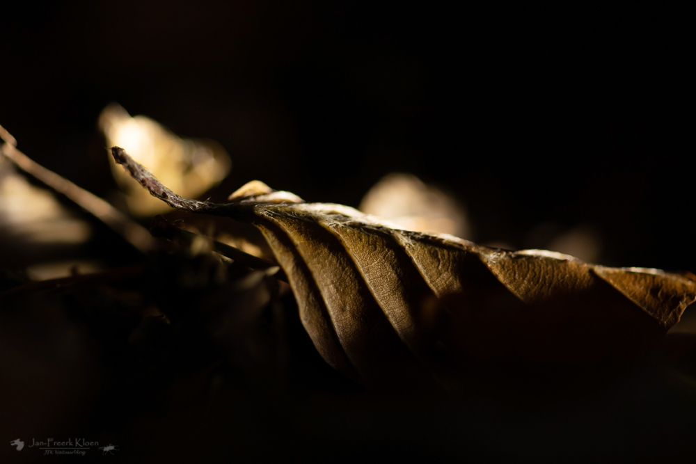 En tot slot een dor blad. Niks aan zou je zeggen, maar dan heb je er nog nooit een foto met tegenlicht van gemaakt. Hiervoor kan je de zon gebruiken, maar in dit geval heb ik het belicht met een zaklamp. De vormen en structuren worden mooi uitgelicht!