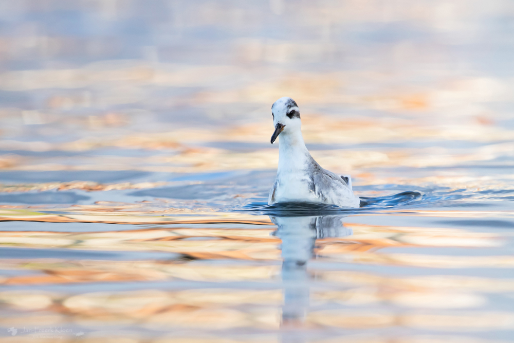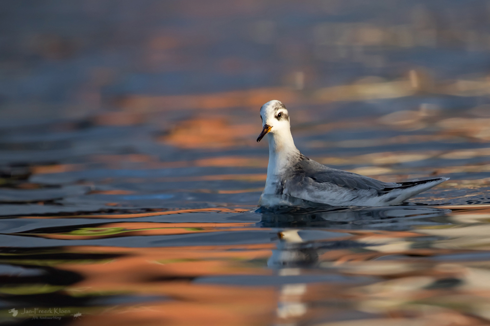 Het beestje zwom op zijn gemakje rond in het smalle plasje, ongeveer een meter uit de kant en zich totaal niks aantrekkend van de vogelaars. De tactiek: aan de waterkant gaan liggen in de richting waar hij naar toe zwemt, foto’s maken terwijl hij naar je toe zwemt en voorbij zwemt. En dan rustig weer voorbij lopen en dan weer van voren af aan.