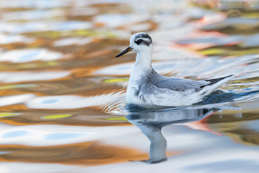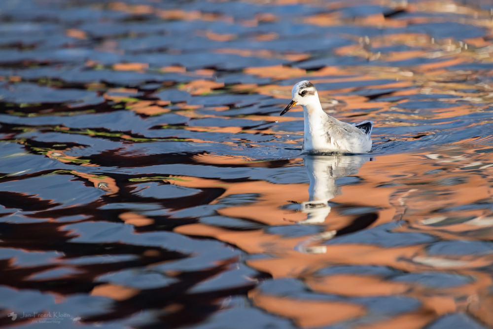 De rosse franjepoot broedt op de hoogarctische toendra, ver van alle mensen vandaan. In broedkleed is hij prachtig roestbruin – waar hij zijn naam aan dankt – met contrastrijke kop- en vleugeltekening. In de winter trekt het beestje over zee richting Afrika, waar hij ver uit de kust overwintert. Daar dobbert hij rond en pikt vlot rondzwemmend plankton op van het wateroppervlak. Vreemd gedrag voor een steltloper; een rare vogel… In de trektijd worden met name jonge vogels af en toe aan de Nederlandse kust gezien, maar nooit in hoge aantallen. Een waarneming zo diep in het binnenland is voor landrotten als ik een buitenkansje.