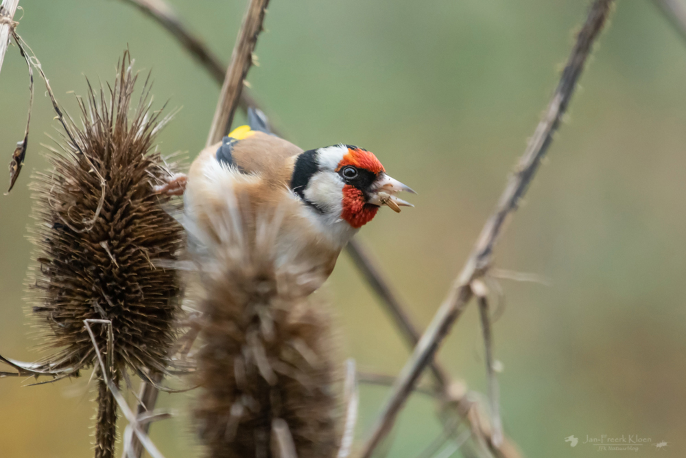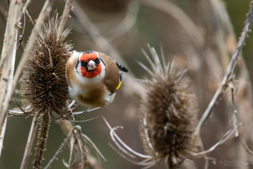 Gelukkig komt ook op deze dagen het puttertje langs. Trouw bezoekt hij al vele jaren de kaardenbollen in onze voortuin, pal voor het raam. Vorig jaar schreef ik daar al een uitgebreid verhaal over.