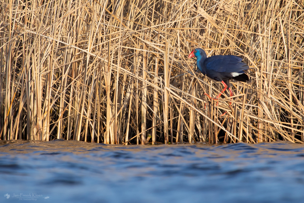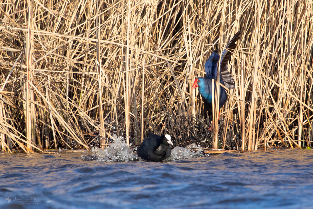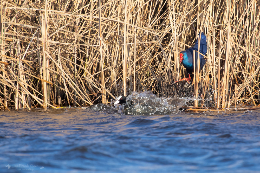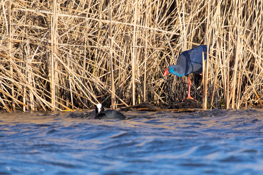 Maar goed, het beest liet zich prachtig zien. Eerst nog wat verstopt in de rietkraag, maar tegelijk met de zon kwam hij tevoorschijn om zijn prachtige purperen verenkleed te showen. De koet, een slagje groter dan een meerkoet en met vooral veel langere poten, liet zich het kaas niet van het brood eten. Nadat hij een waterhoen rustig had laten passeren kwam hij verderop in de rietkraag een meerkoet tegen. Dit zwarte neefje werd genadeloos weggepest door middel van bommetje van achteren. De arme meerkoet…