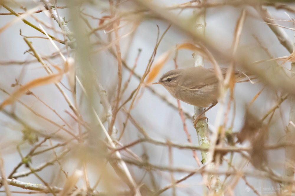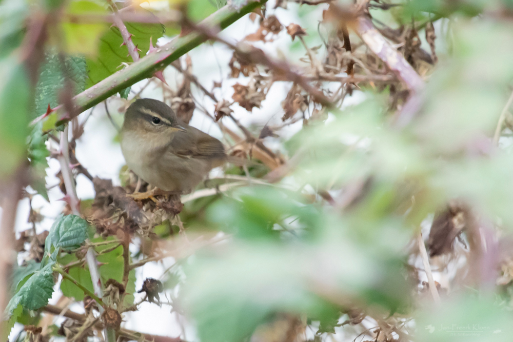 Deze zeldzaamheid was niet de enige van Alblasserdam. Niet geheel toevallig, er hangen immers al een tijdje erg veel vogelaars rond, werd in de buurt ook een klein bruin vogeltje ontdekt. Ook deze bruine boszanger was nieuw voor mij en werd dus met een bezoekje vereerd. Zo fraai als de purperkoet was, zo lelijk was deze. Steeds achterin het struweel, amper te volgen door de dichte begroeiing. De enige hulp was het tikkende geluidje dat hij bijna non-stop maakte. Naar omstandigheden heb ik hem nog best goed op de foto, makkelijk was het zeker niet.