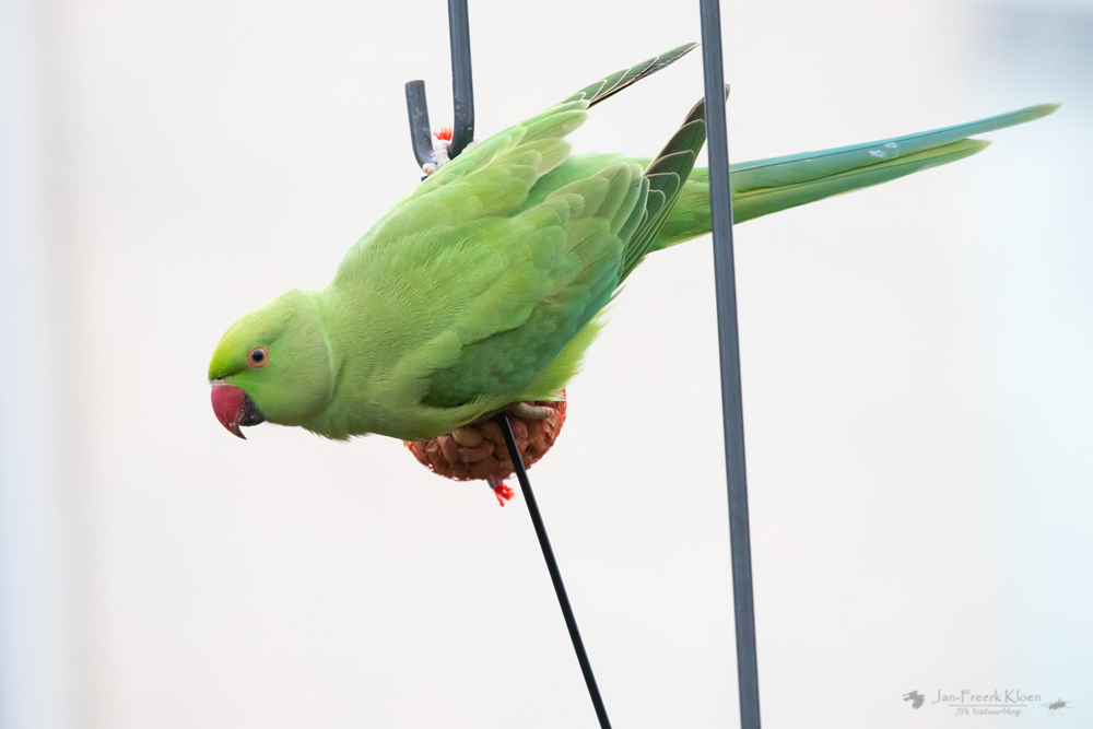 Een halsbandparkiet op vogelvoer in een achtertuin.