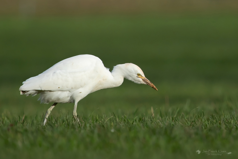 Toen we aan kwamen rijden dacht ik in eerste instantie dat er wat kippen naast de ren liepen, het was daadwerkelijk pal naast een kippenren, maar het waren toch echt de kleine witte reigertjes. Direct naast een boerenerf en op slechts kleine afstand van de weg. Toen de beestjes even opgepest werden door een hard langsstuivende auto zag ik mijn kans schoon en ging verdekt achter een houten hek liggen. Langzaam maar zeker kwamen de koereigers weer terug wandelen, tot ze op amper 20 meter van mij af liepen. Druk met hun snavels in de klei prikkend op zoek naar wormen. Schoner werden ze er niet van, maar een mooi tafereeltje was het wel. Helaas waren ze wat zenuwachtig van de blaffende hond op het erf en toen de boerin eieren kwam rapen werd het ze te veel en vlogen ze verder naar achter.