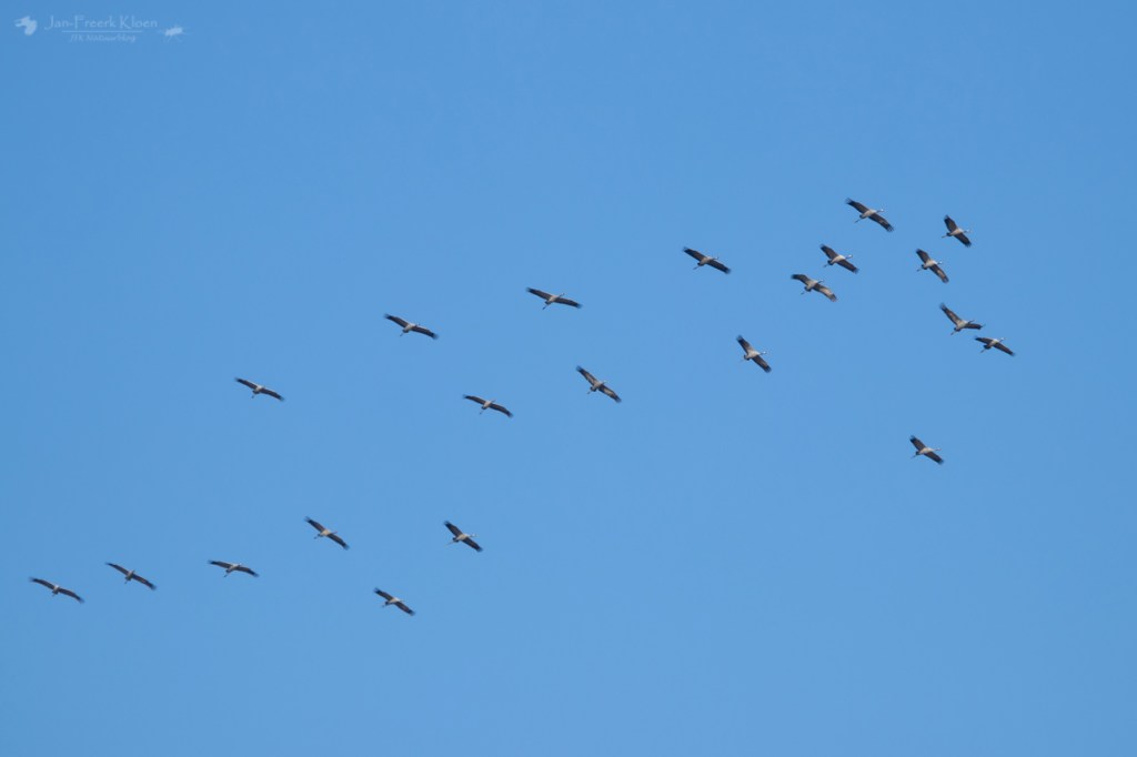 De grote afleiding kwam toen ik in de verte een groepje kraanvogels hoorde. Vijf exemplaren zetten de landing in, maar amper te zien door de trillende lucht. Daar hield het niet bij op. Er kwamen meer en meer kraanvogels aan, eerst wat kleine groepjes, snel gevolgd door grotere groepen. Alles bij elkaar moesten het er enkele honderden geweest zijn. Allemaal kwamen ze van hoog in de lucht aanzetten en doken omlaag het gebied in. Wat volgde was een wilde rit over het smalle Franse weggetje in een poging de arriverende kraanvogels van dichterbij te bekijken. Het was lastig te vinden en we hadden het bijna opgegeven, toen ik nog een flinke groep van zeker honderd kraanvogels laag boven het gebied zag vliegen. Snel reden we in de richting, maar door de bomen waren de dieren moeilijk te volgen. Toch zagen we nog een kleiner groepje van 21 kraanvogels van heel dichtbij. Ze vlogen pal boven de weg en maakten hoogte. Ook op het eind van de dag was er nog wat thermiek en samen met een ooievaar cirkelden ze hoger en hoger tot ze in de verte verdwenen. Deze waren kennelijk nog niet aan slapen toe en trokken verder. Een geweldig einde van de dag.