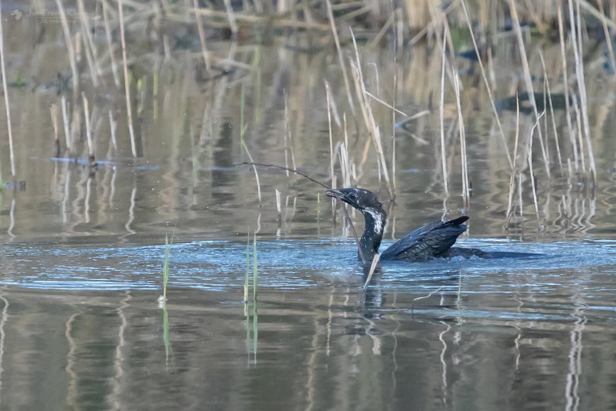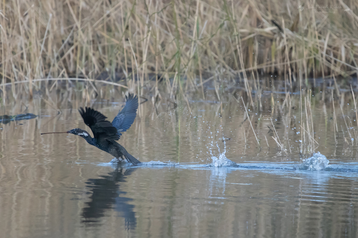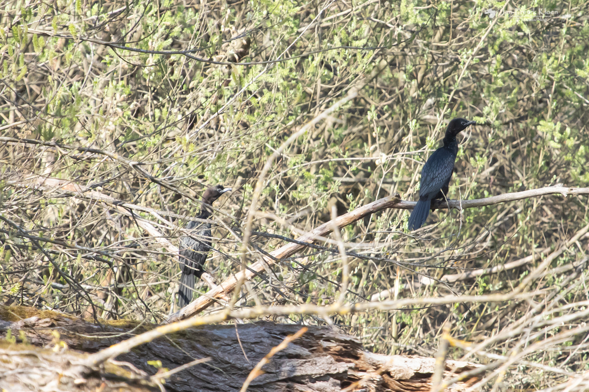 Inderdaad waren hier nog veel meer dwergaalscholvers te zien, samen met gewone aalscholvers. Maar dat was niet alles. Er vloog ook een zwarte ibis over en bovendien twee roofvogels. Eentje was niet spannend: een bruine kiekendief. Maar de andere was veel groter, een heuse arend. Hij werd aardig gepest door de kiekendief, maar kwam van een afstandje fraai langsvliegen. De bastaardarend draaide een paar keer rond met de kiekendief achter zich aan en verdween toen achter de bomen. Zeker voor Italiaanse begrippen een bijzondere waarneming: het is slechts een zeer zeldzame wintergast.