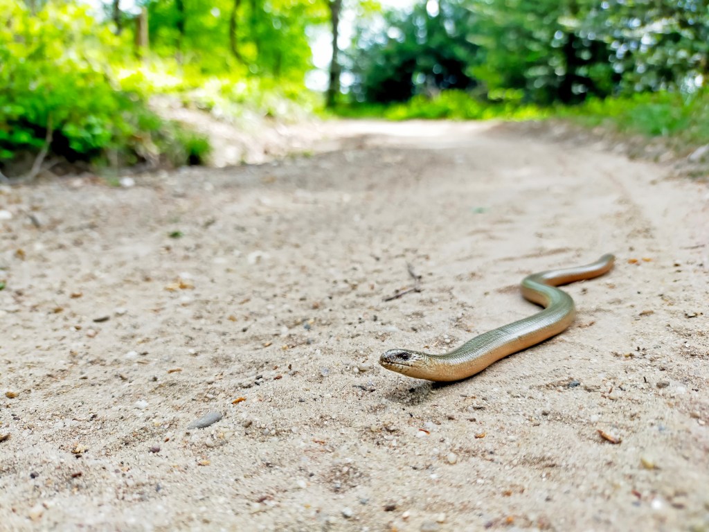 Tot nu toe was mijn oplettendheid steeds overbodig, maar vandaag niet. Er kroop een hazelworm het pad over. Gelukkig zag ik het beestje op tijd om hem te ontwijken en ik stapte snel af om hem te redden van eventuele achterliggers. Die waren er even niet, dat scheelde weer. De hazelworm probeerde intussen weg te komen, maar onhandig als ze zijn spartelde hij wat rond in het zand alsof hij heel snel aan het vluchten was, maar hij kwam amper vooruit. Ik ondersteunde hem met mijn handen zodat hij zelf de hei in kon glijden. Voor dit dier was ik in elk geval op tijd.