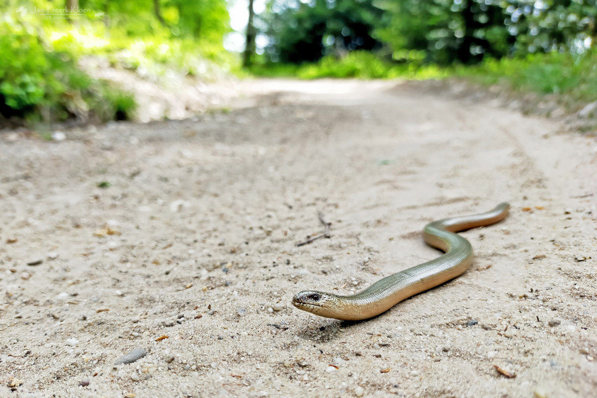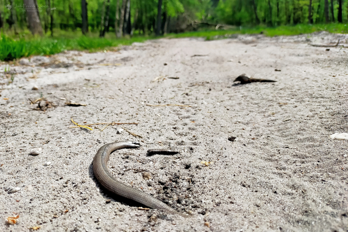 Niet lang na deze waarneming vond ik op het stuk mountainbikeroute dat over de zuidkant van Planken Wambuis loopt kort na elkaar nog drie hazelwormen op het pad. Allemaal nog in leven, al was van eentje de staartpunt net niet meer heel. Waarschijnlijk geraakt door de mountainbiker voor mij, maar daar komt hij wel overheen. Snel redde ik de ongelukkige pootloze hagedissen van het mountainbikepad, waarbij me weer opviel dat ze veel moeite hadden met voortbewegen over het gladde zand. Uiteindelijk heb ik ze alle drie moeten oppakken om ze in veiligheid te brengen, anders zat er echt geen vaart in.