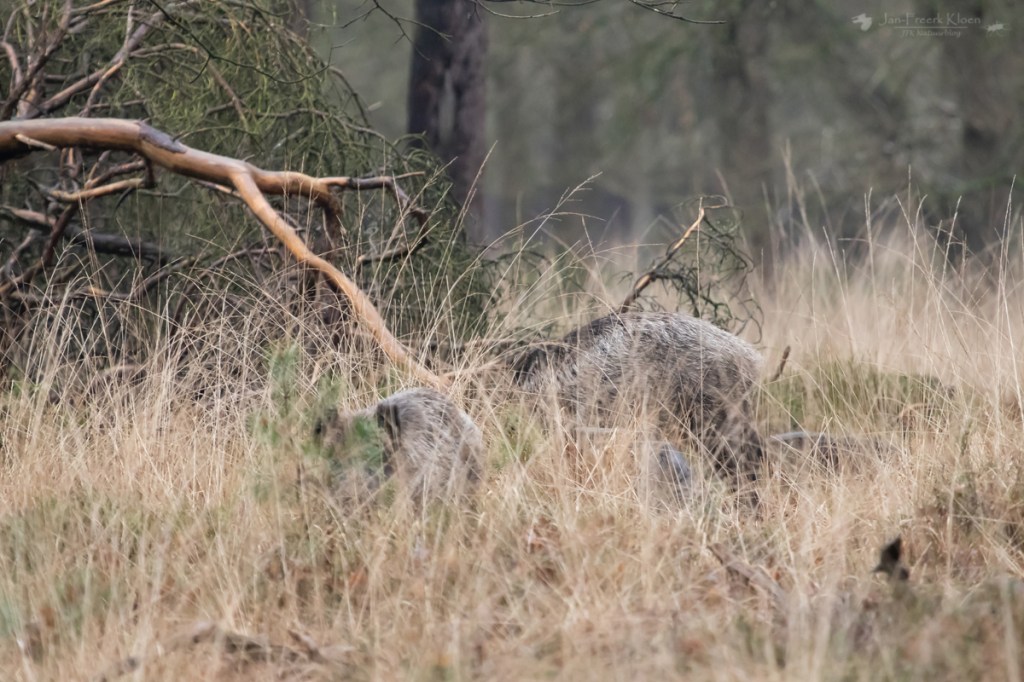 Omdat ik vandaag niet heel veel tijd heb is het rondje wat kleiner dan de vorige keer. Op de terugweg vind ik wederom de prooien van de wolf, en makkelijke ook. Vlak langs het pad liggen een paar verzwakte wilde zwijnen. Er is weinig voedsel deze winter en eentje blijkt al het loodje gelegd te hebben. De andere drie reageren traag op mijn aanwezigheid. Ze gaan zitten en na een tijdje staan en kijken mij aan. Als ik langdurig terugkijk draaien ze zich om en lopen met een sukkeldrafje dieper het bos in. Wolvenvoer…