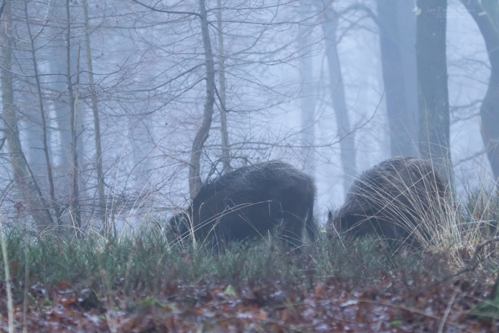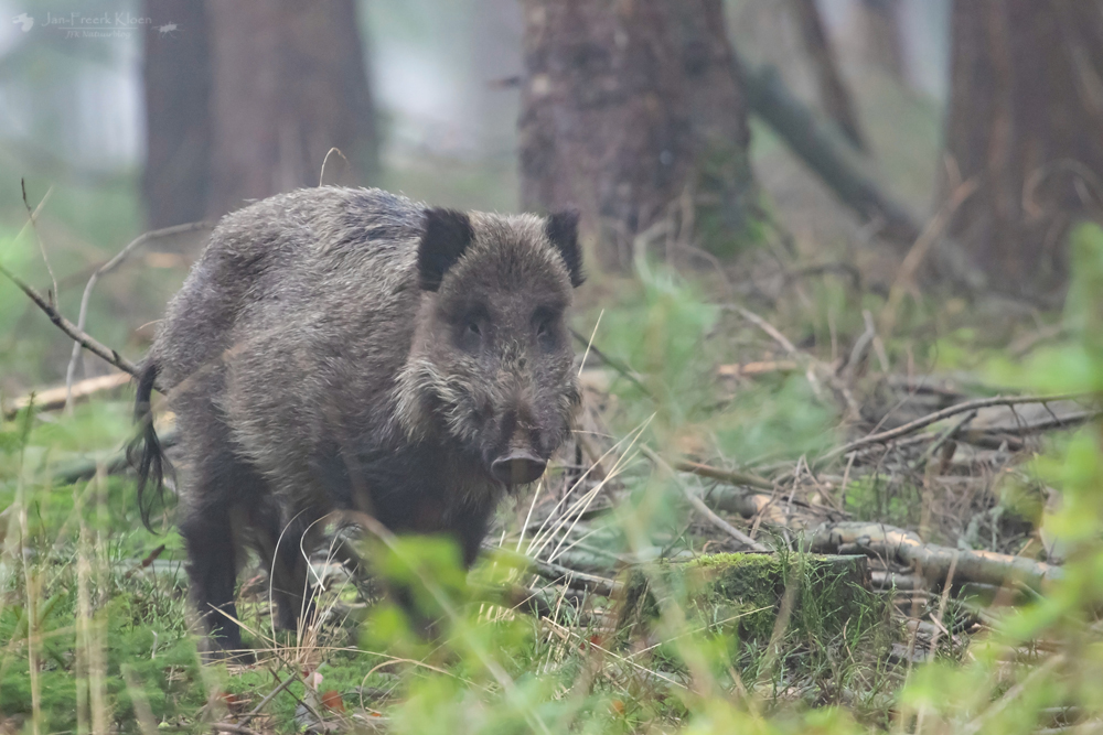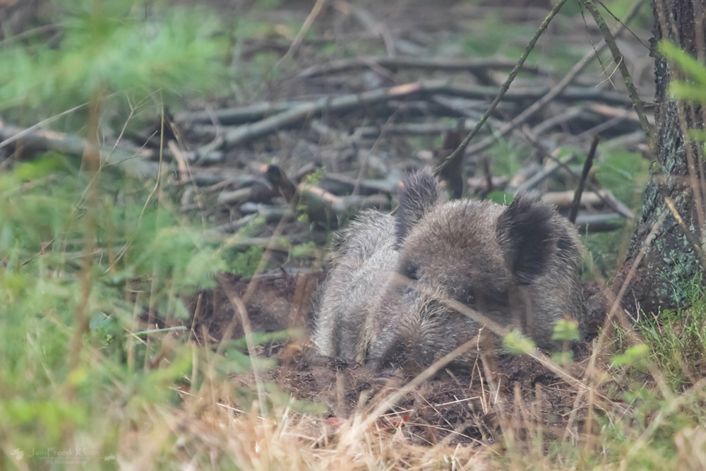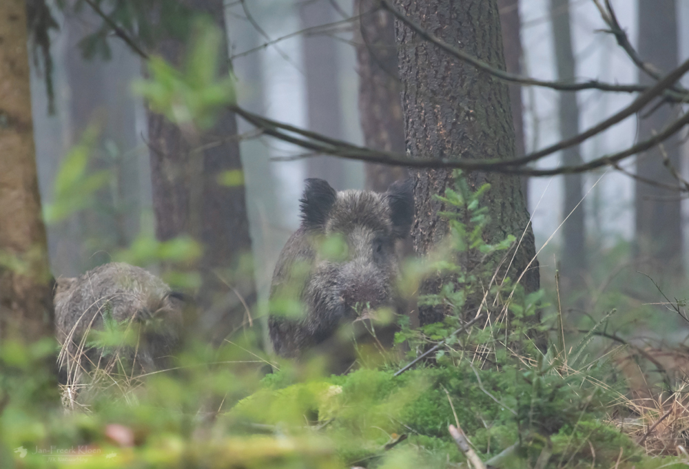 Vlak voor mij ontdek ik twee zwijnen die rustig in de bosbessen lopen te wroeten. Ze konden mij niet van ver zien aankomen, maar ook als ik echt dichtbij kom negeren ze mij volkomen. Ondanks de zeer geringe afstand is het niet mogelijk een fatsoenlijke foto te maken.
