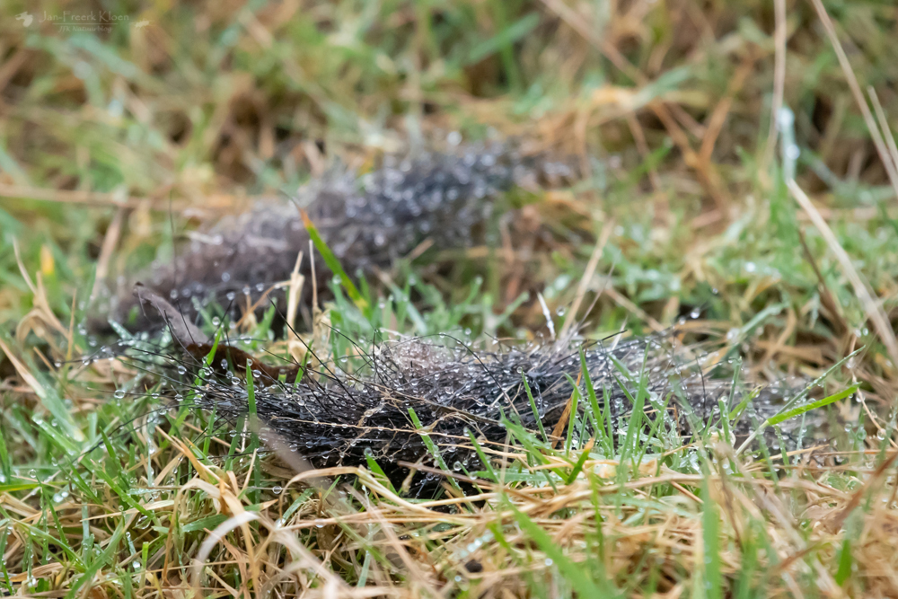 Ook de wolven zijn in de afgelopen drie weken weer lekker actief geweest. In de omgeving waar ik de meeste kans op een ontmoeting denk te maken vind ik weer veel sporen van de grote honden. Op maar liefst veertien nieuwe plekken liggen drollen – weliswaar allemaal niet heel vers. Op één plek vind ik een loopspoor van waarschijnlijk een paar dagen oud. Het loopt op een beschutte plek, waardoor het nog niet helemaal weggevaagd is.