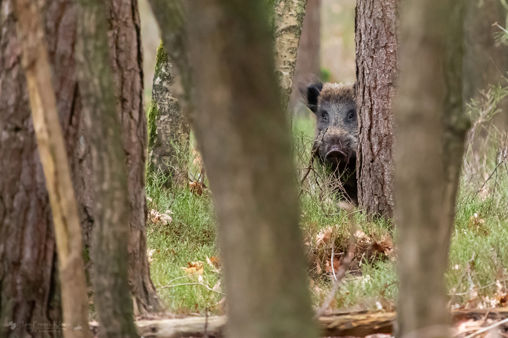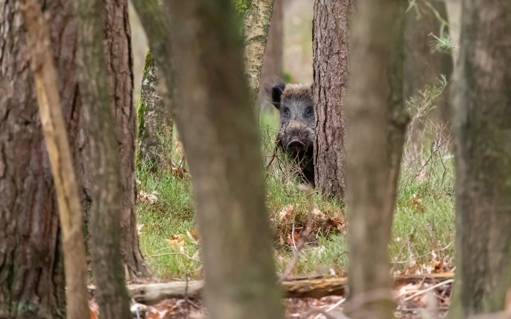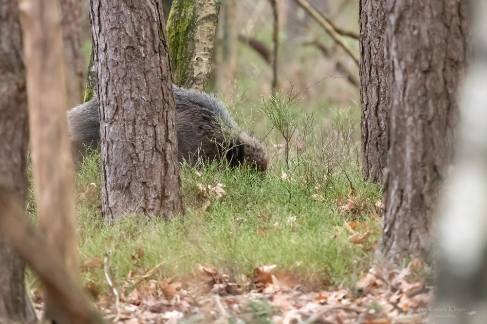 Pas als ik bijna bij de parkeerplaats kom zie ik ook levende zwijnen. Twee stuks, eentje op afstand en eentje die steeds dichterbij komt. Hij kan mij niet ruiken door de wind en blijkbaar ben ik zo stil dat hij me ook niet hoort. Pas als hij me ongemerkt tot op ongeveer dertig meter genaderd is heeft hij me door, kijkt op en rent een stukje naar achteren. Als alle zwijnen hier zo alert zijn als de zwijnen die ik zie zijn ze geen moeilijke prooi voor een roedel wolven. De prijs van een slecht eikel- en beukennootjesjaar.