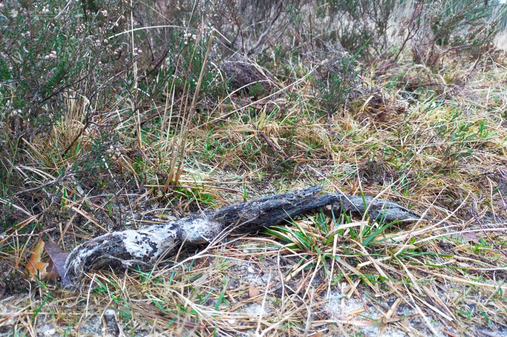 Ook vannacht was het wild goed actief geweest. Overal zijn kriskras pootafdrukken van herten te vinden en zo nu en dan zwijnen, vossen en twee keer van een das. Ook wat wolven betreft begint het hoopvol: al na twee kilometer lopen vind ik een grote drol zoals ze in de boekjes beschreven worden: ruim twee centimeter dik, meer dan dertig centimeter lang (in twee delen) en tjokvol zwijnenhaar en botresten. Maar anders dan de meeste verdroogde drollen die alleen nog maar uit de genoemde onderdelen bestaan is deze drol nog nat met een soort bruine gelei. Een verse dus! En daarnaast zijn er ook nog een hoop oudere drollen te vinden. Het zwaartepunt van het wolventerritorium is duidelijk nog in gebruik!