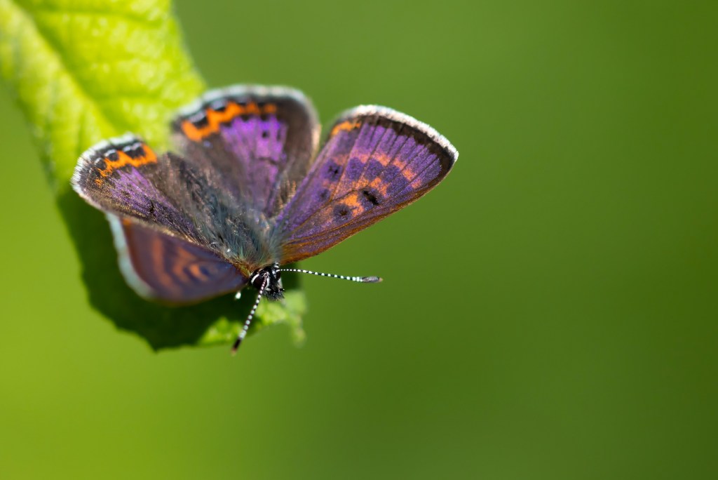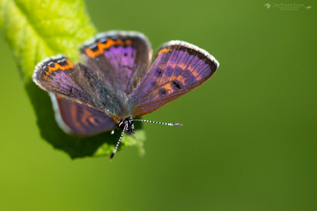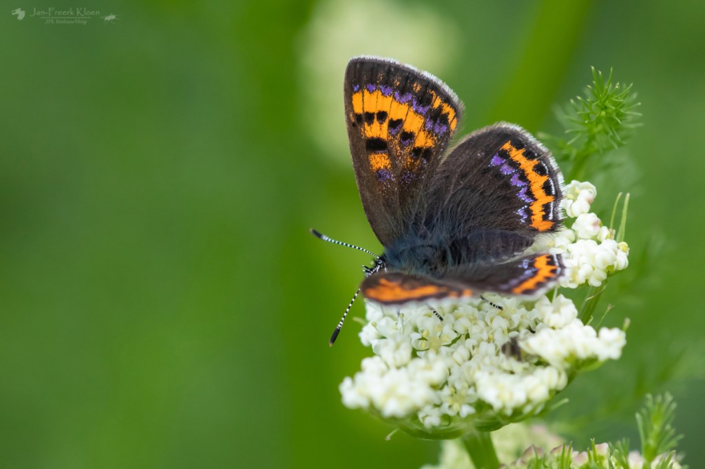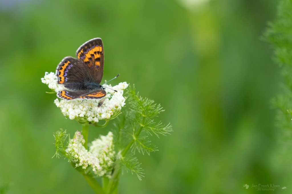 Vlak voor Monschau verlieten we de makkelijke fietsroute. We doken de berg af via een steile weg omlaag, Monschau in. Een prachtig en gezellig dorpje in het dal. De fietsten er doorheen en beklommen aan de andere kant weer de berg, tot de Perlenbachsperre, een stuwmeer in de Perlenbach. Via goed berijdbare bospaden kwamen we in een zijdal uit, waar we het stevig te verduren kregen. Een berg oprijden met bagage is nog niet zó makkelijk. Het ging zo langzaam dat ik afgeleid werd: naast het pad ontdekte ik een opvallend vlindertje op een bloem die wel even wat aandacht nodig had. Hij bleek niet alleen te zijn. In de bosrand ontdekte ik steeds meer blauwe vuurvlinders. Omdat het al vrij laat was voor die soort waren de meeste best versleten, maar een aantal ook nog heel erg mooi. Eentje had zelfs een prachtige paarse glans op de bovenkant van de vleugels, de meeste hadden het beperkt tot een rij kleine paarse vlekjes. En dan de onderkant: met het knal oranje kwam hier het ‘vuur’ van de naam mooi tot zijn recht.