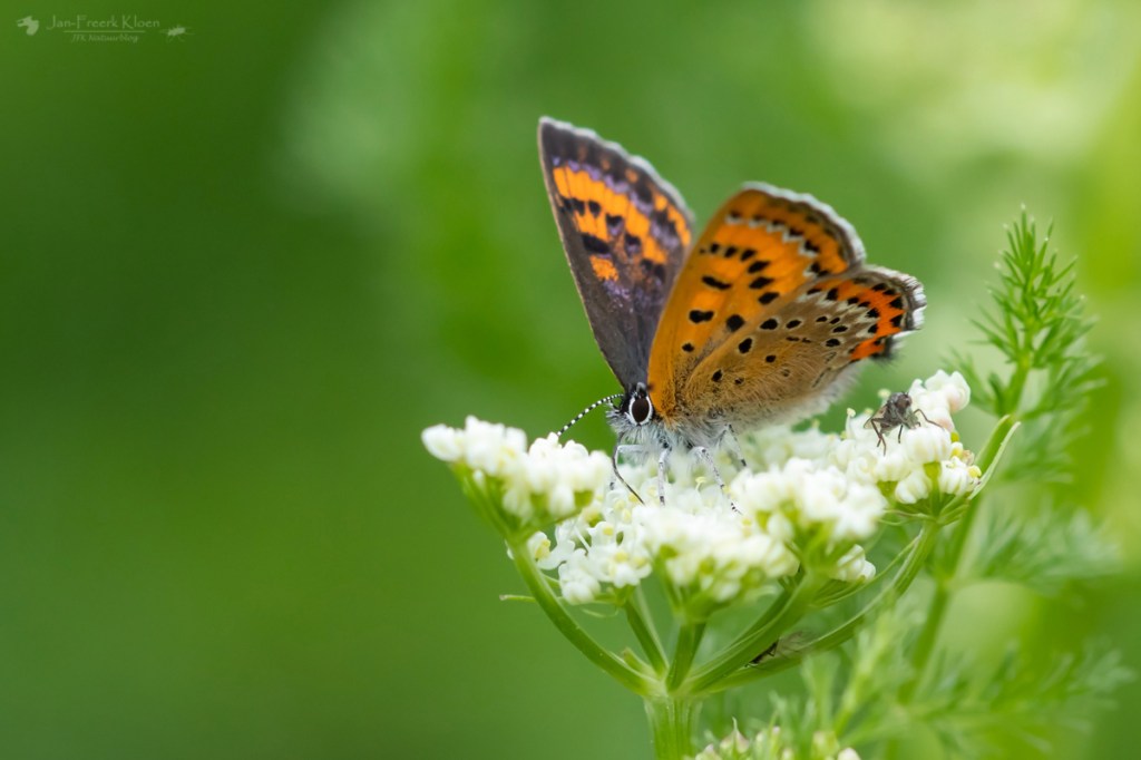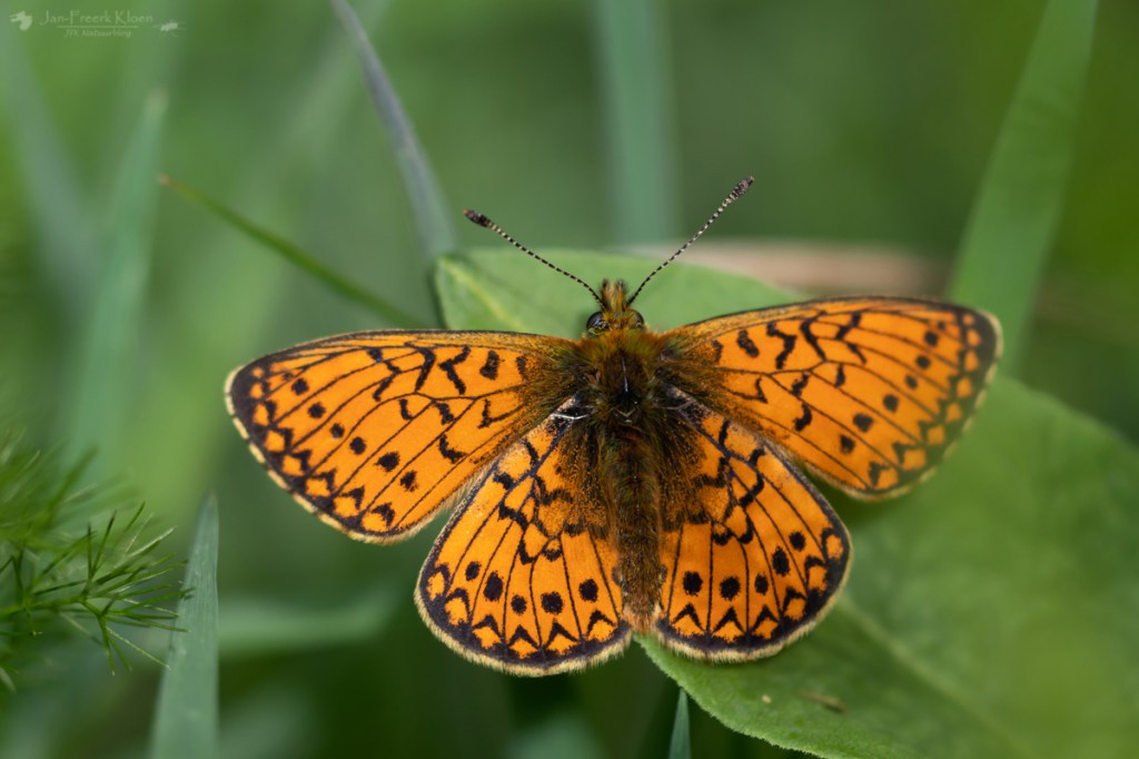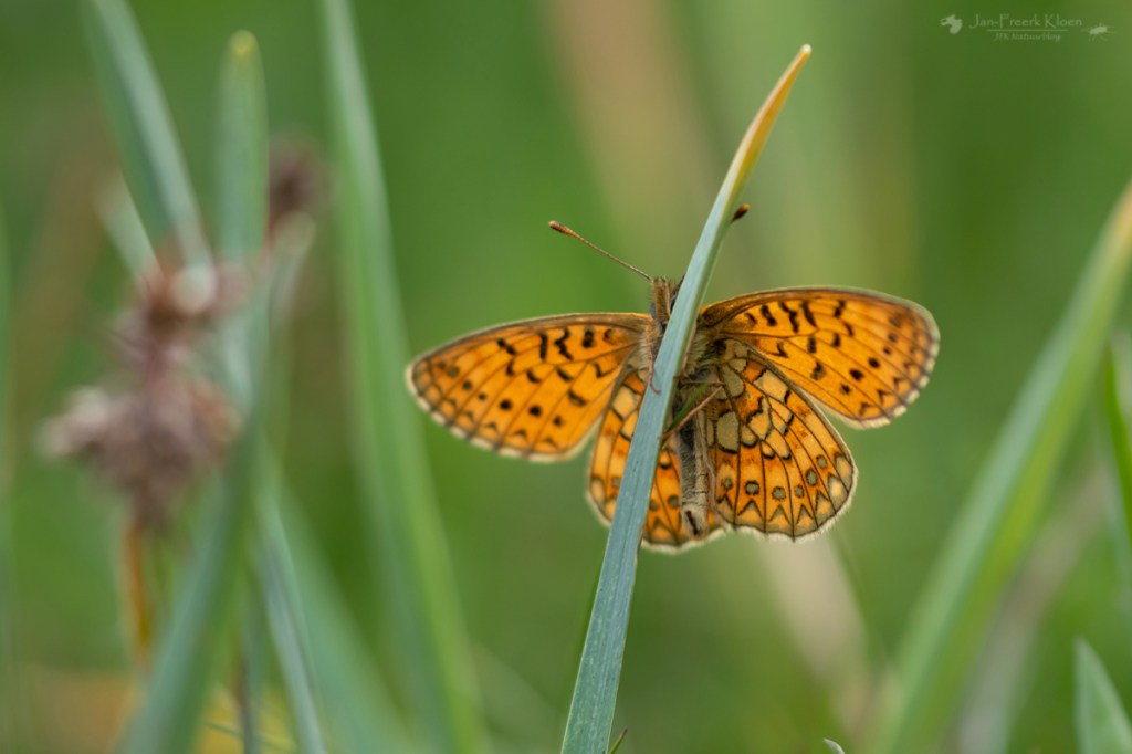 Toen ook de zon weer even terugkwam van achter de wolken kwamen er ook een paar parelmoervlinders tevoorschijn, weer een mooie buitenlandse soort. Ik moest het opzoeken, maar het bleken ringoogparelmoervlinders te zijn. Vrij sober getekende knal oranje vlinders met op de onderkant van de vleugels een rijtje vlekjes die op ringetjes lijken.