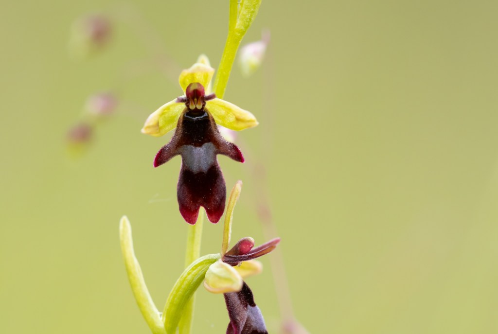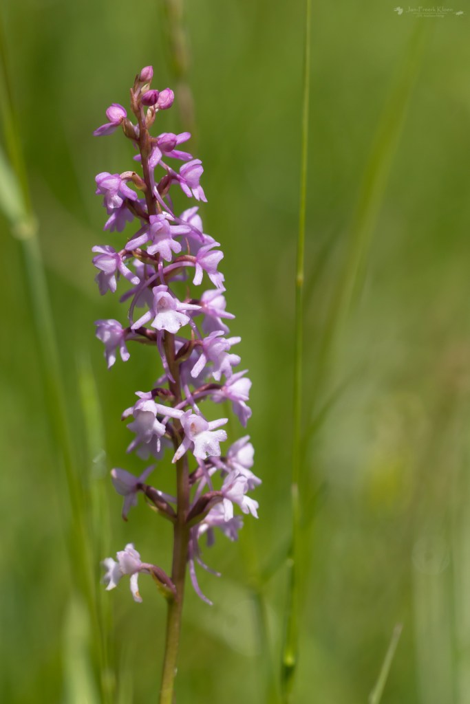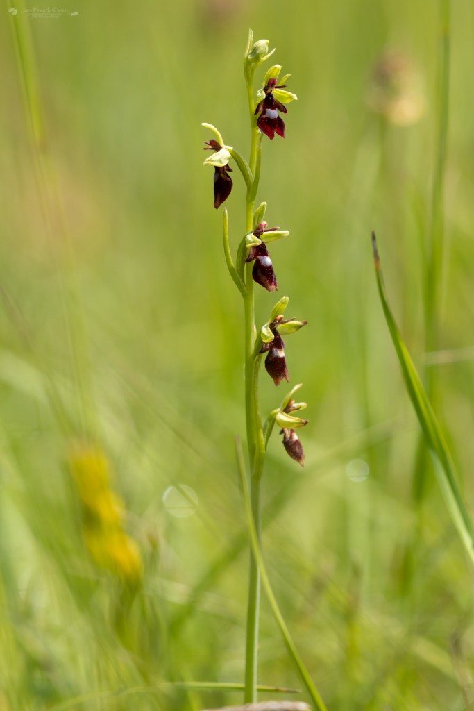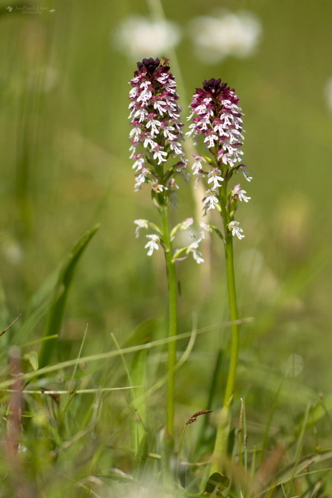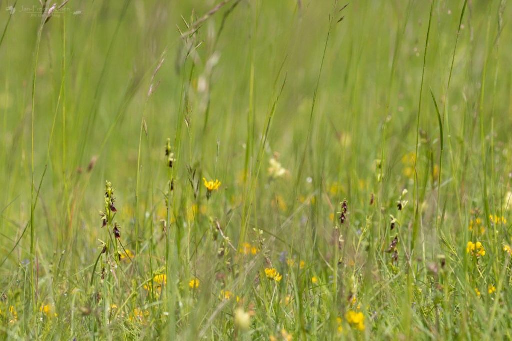 Maar toen we wat beter keken zagen we de de veel onopvallender vliegenorchis er minstens net zo veel stond. In één hoek zelfs een heel veld vol. In de struweelrandjes stonden ook nog purperorchissen en in een hoekje twee aangebrande orchissen. Midden op het paadje stond een bijenorchis nog in knop, met stokjes erbij om wandelaars eromheen te leiden. Toen ik ergens de bosjes in liep omdat ik een bleek bosvogeltje dacht te zien bleek dat toch een bergnachtorchis te zijn, maar toen ik in de bosjes om me heen keek bleek het bleek bosvogeltje er ook ‘gewoon’ te staan. Ook een mooie orchidee.