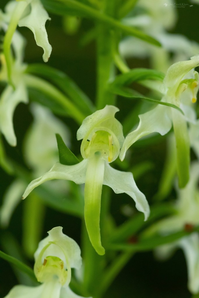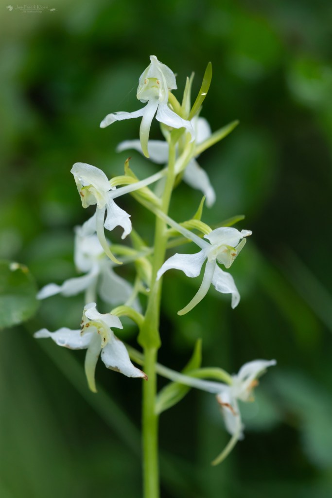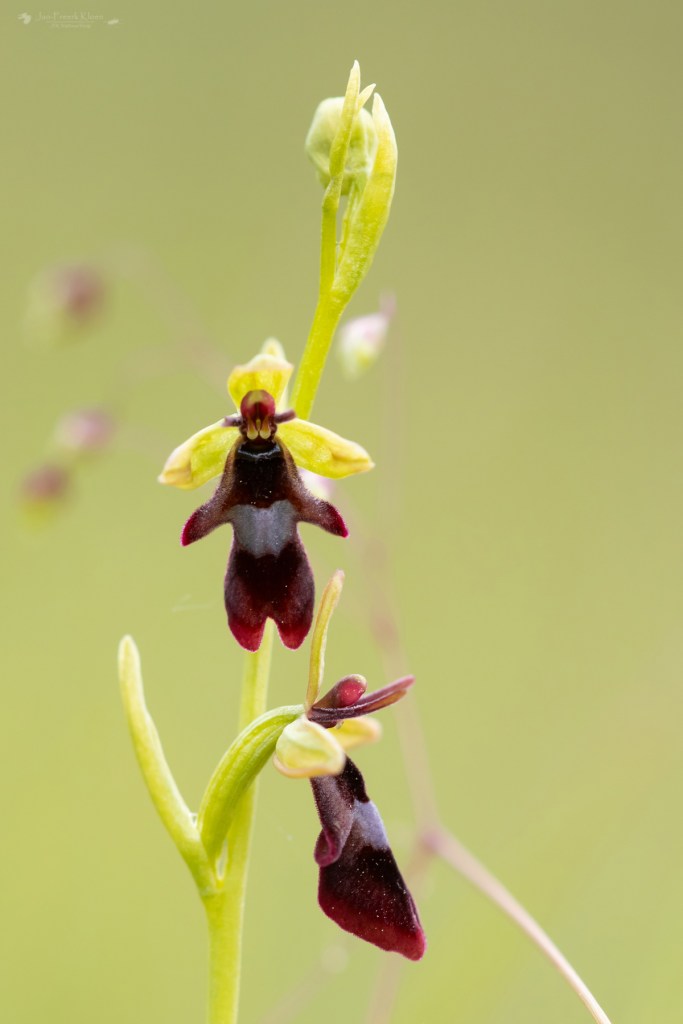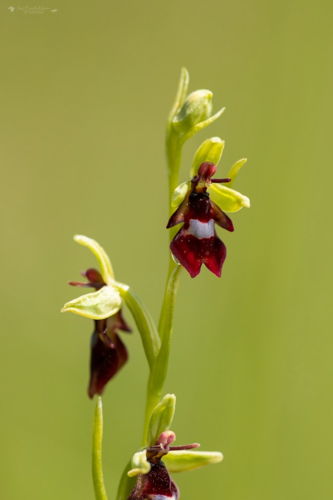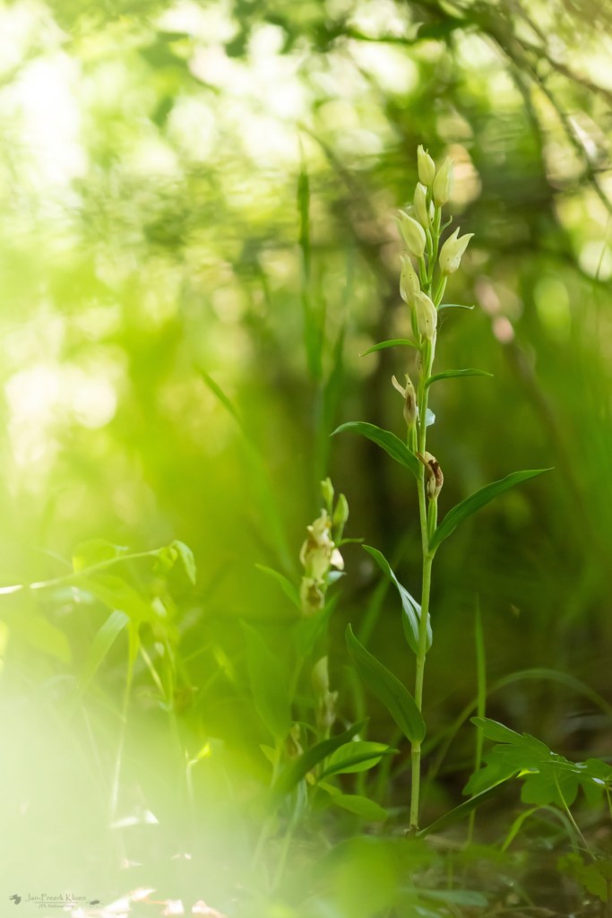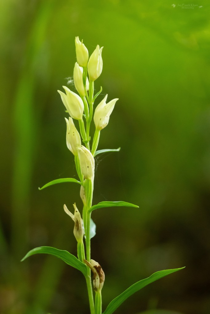 Maar toen we wat beter keken zagen we de de veel onopvallender vliegenorchis er minstens net zo veel stond. In één hoek zelfs een heel veld vol. In de struweelrandjes stonden ook nog purperorchissen en in een hoekje twee aangebrande orchissen. Midden op het paadje stond een bijenorchis nog in knop, met stokjes erbij om wandelaars eromheen te leiden. Toen ik ergens de bosjes in liep omdat ik een bleek bosvogeltje dacht te zien bleek dat toch een bergnachtorchis te zijn, maar toen ik in de bosjes om me heen keek bleek het bleek bosvogeltje er ook ‘gewoon’ te staan. Ook een mooie orchidee.