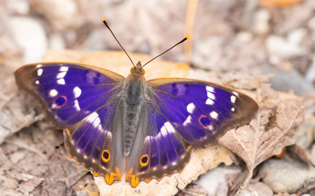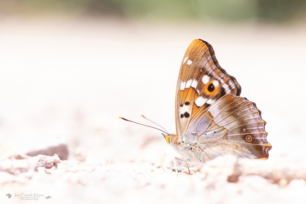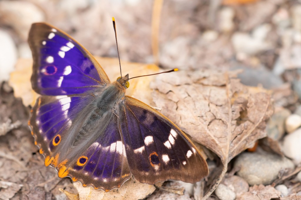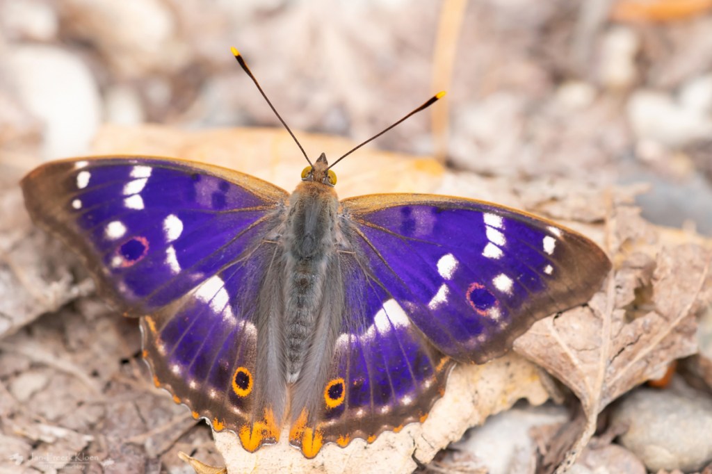 De grote vlinders benaderen ging moeilijk omdat het ook vrij warm was, ze waren lekker op dreef. Maar na een tijdje kwam ik erachter dat ze zelf eigenlijk ook wel aan schaduw toe waren. Toen ik een tijdje stil bleef staan op één plek kwam er eentje zo ongeveer tussen mijn benen in zitten. Ik kon hem van boven prima op de foto krijgen, inclusief de prachtige blauwe weerschijn waar de verder donkerbruine vlinder zijn naam aan te danken heeft. Zoals je op de foto’s kunt zien is het erg van de invalshoek afhankelijk of je de paarsblauwe glans wel of niet te zien krijgt.
