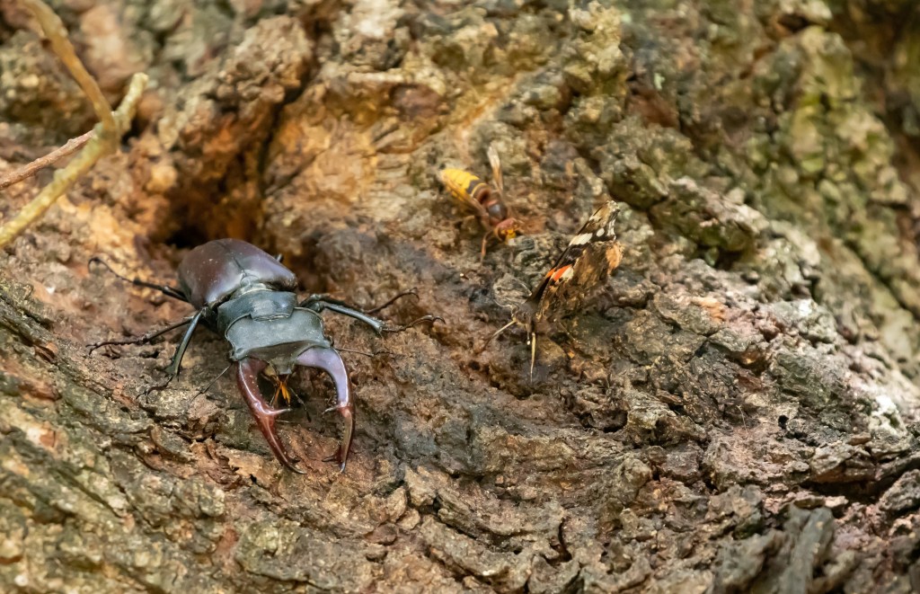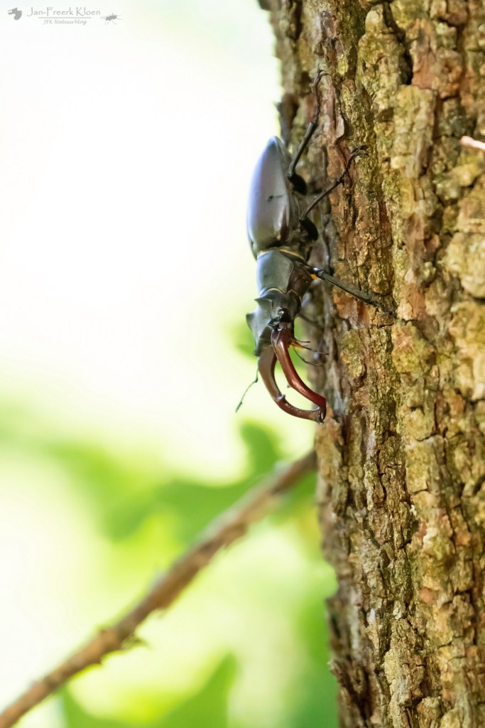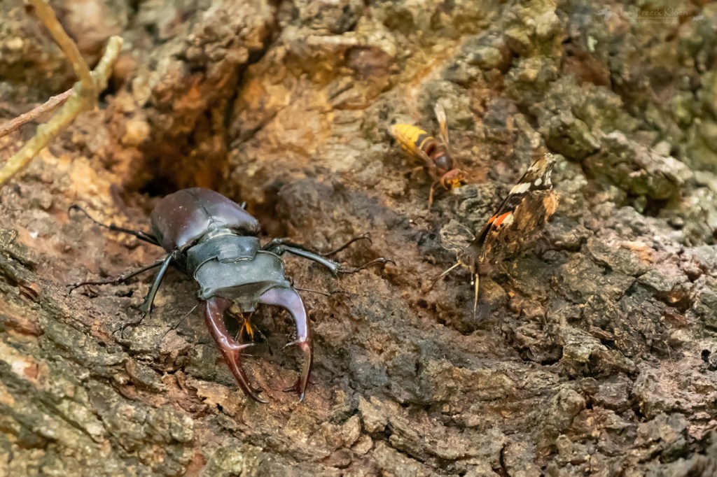 En dan de eik waar ik zo graag rondkijk in deze tijd van het jaar. Vorig jaar zag ik er véél vliegende herten. Nu was het al laat in het seizoen en bovendien ’s ochtends, maar toch vonden we mijn geliefde reuzenkever op zijn plekkie. We zagen drie mannetjes die rustig door de boom kropen en dronken van het eikensap dat uit een wond in de boom stroomde.