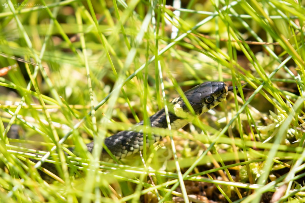 Maar goed, we moesten de reptielen niet vergeten. Ik liep op twee plekken naar het water waar ik de oever kon bereiken en dat leverde op beide plekken een ringslang op die rustig in de waterplanten hing. Na mij gezien te hebben gingen ze er vandoor. Op een andere plek vond Kylian er ook eentje op de oever. Allemaal hingen ze bij het water rond voor verkoeling en om jacht te maken op de vele kikkers.