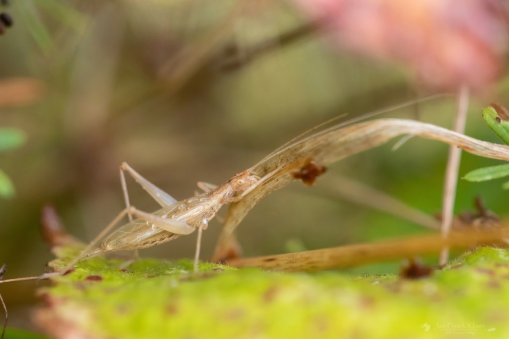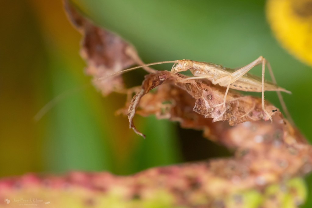 Dan de boomkrekel nog, ook een zeldzame soort en lastig te vinden bovendien. De schutkleur is fantastisch, het geluid hard en hol. Twee jaar geleden vond ik er eentje in de tuin, die zat avonden achter elkaar te roepen. En ik kon zoeken wat ik wilde, ik heb hem niet gezien. In Spanje, waar hij veel algemener is, zag ik hem deze zomer wel. Maar natuurlijk precies op een avond dat ik mijn camera niet mee had…