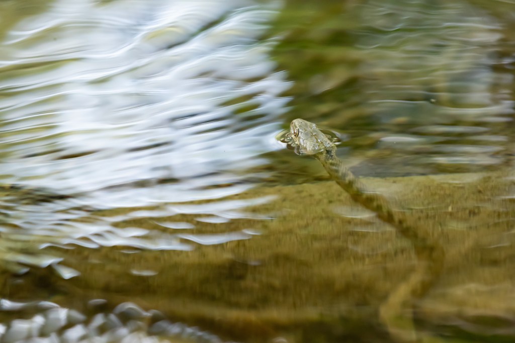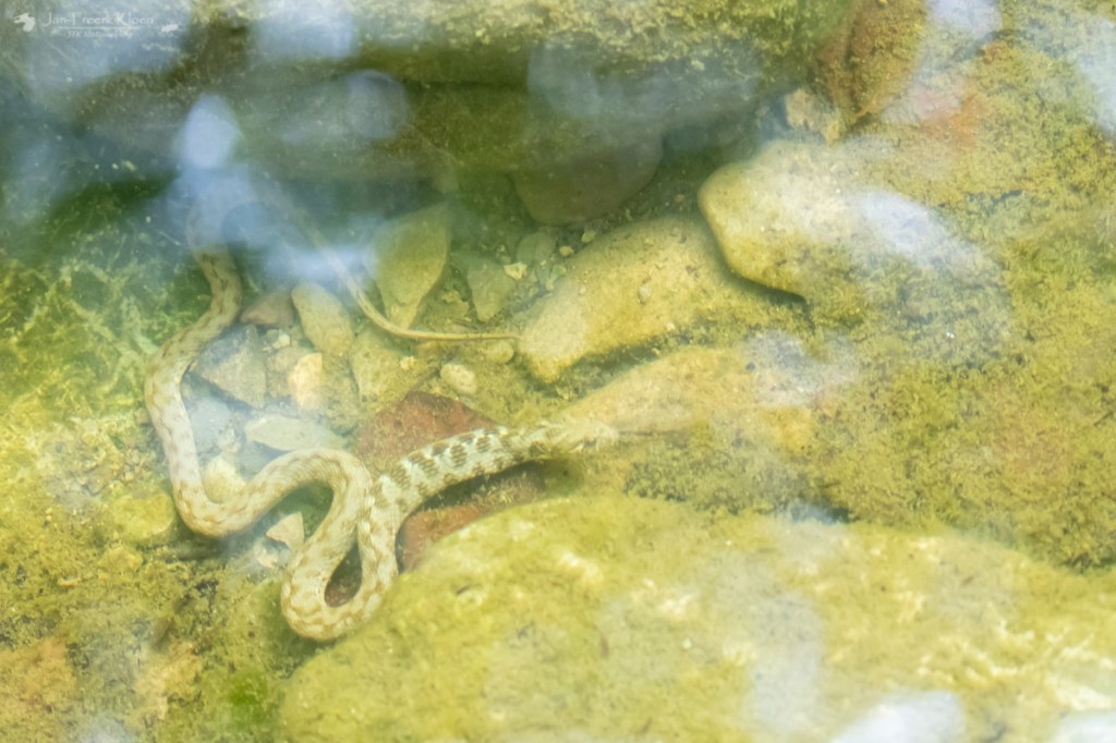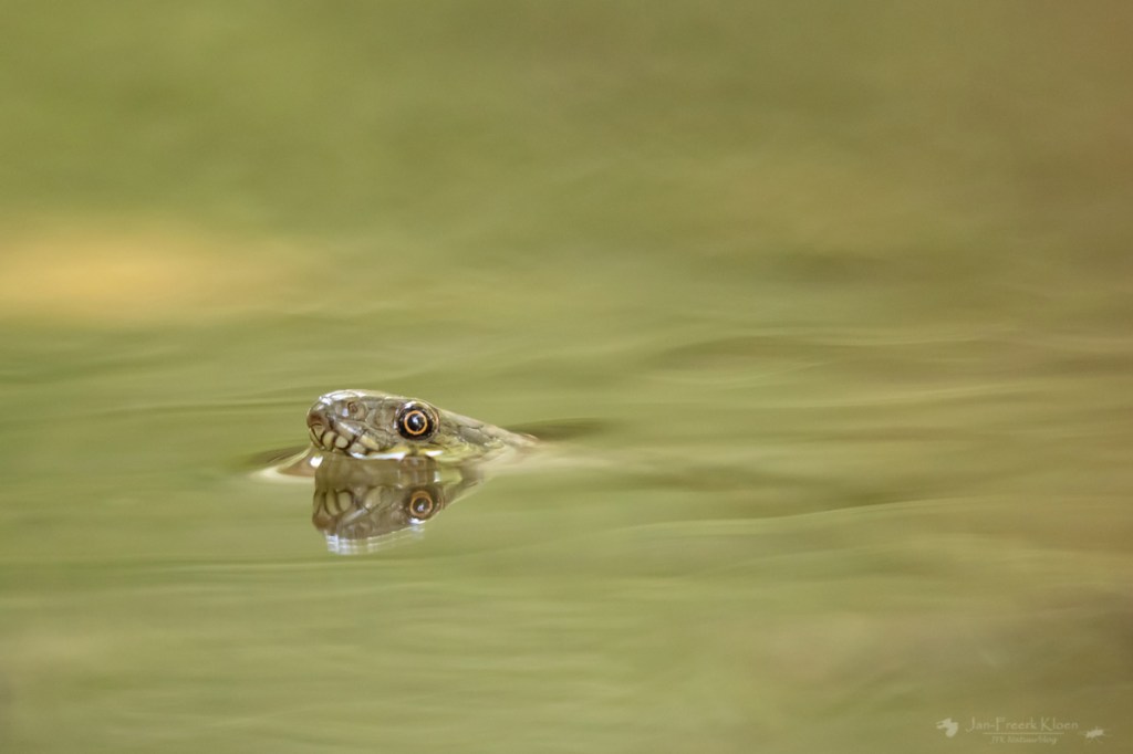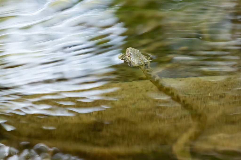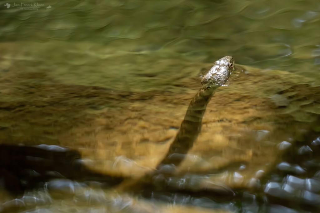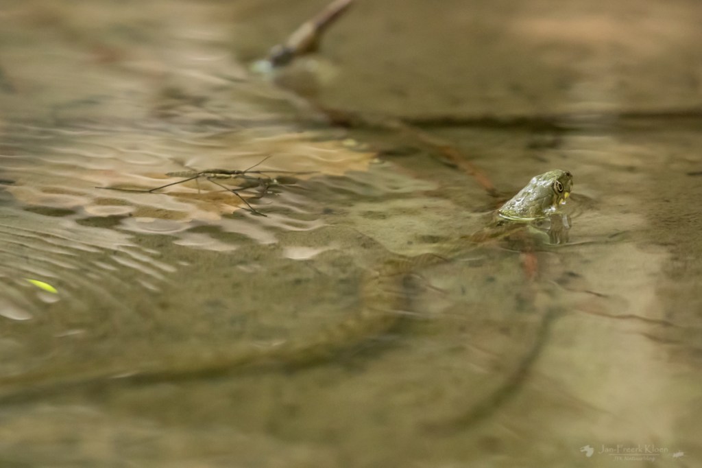 De volgende ochtend moest het hele kamp uitbrakken van de vleermuizennacht. Ik niet, want ik had lekker geslapen. Ik ging weer bij de adderringslang kijken omdat ik nog niet erg tevreden was over mijn foto’s. Ik wachtte net zo lang tot ik door had waar hij (meestal) naar lucht kwam happen. Hij kan natuurlijk niet eindeloos onder water blijven. Op die momenten wist ik hem op de foto te krijgen.