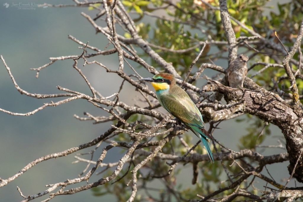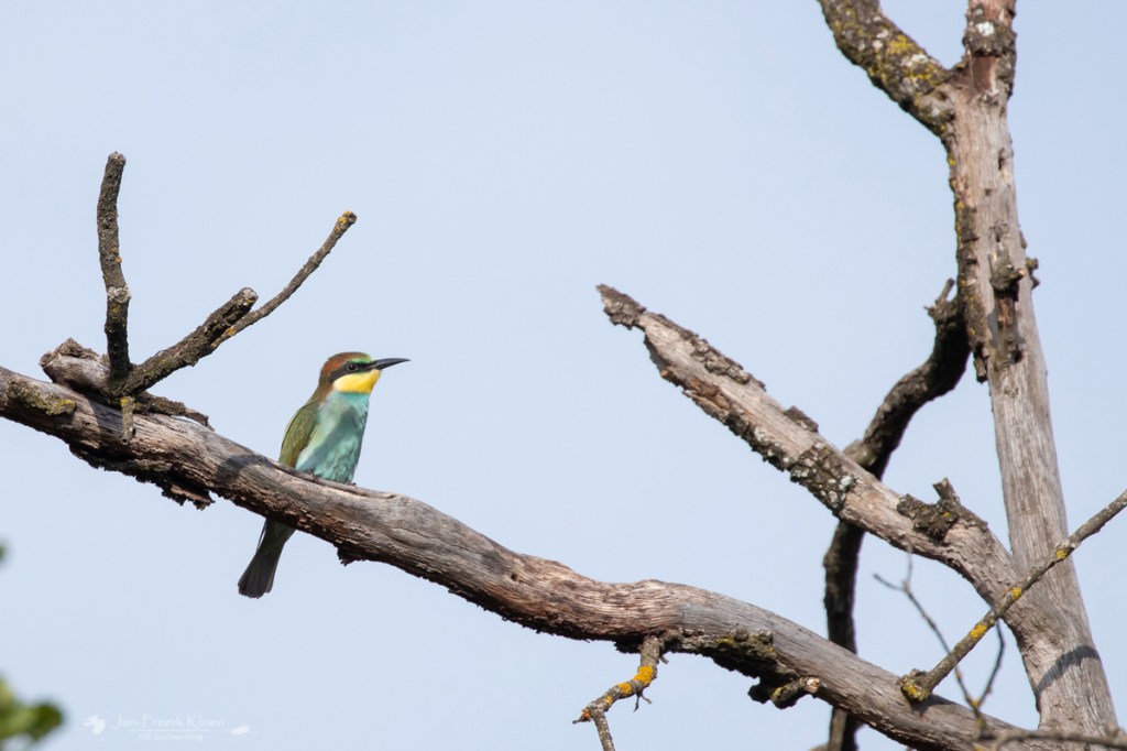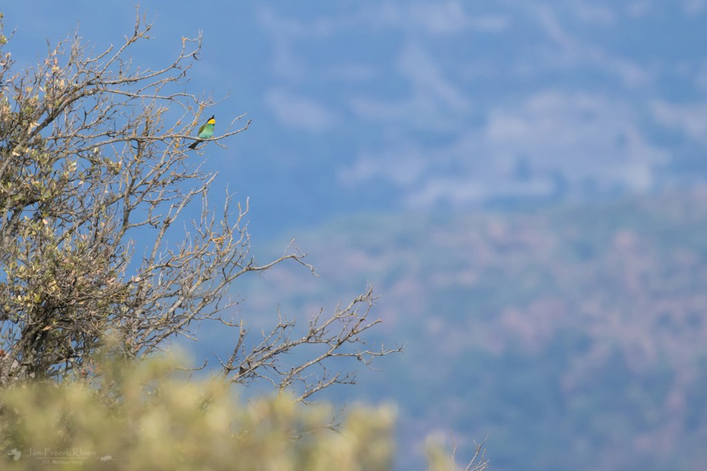 Na de dieren bij de rivier liepen we nog even de berg bij het kampterrein op. We hoorden dichtbij bijeneters en wisten ze ook te vinden. Wat een prachtige, kleurrijke vogels! In Nederland zijn ze erg zeldzaam, maar in Spanje is het net een spreeuw. Het vrolijke geluidje hoor je vaak boven je en soms zie je ze in flinke groepen jagen op insecten. Deze keer kregen we ze zelfs van best dichtbij te zien!