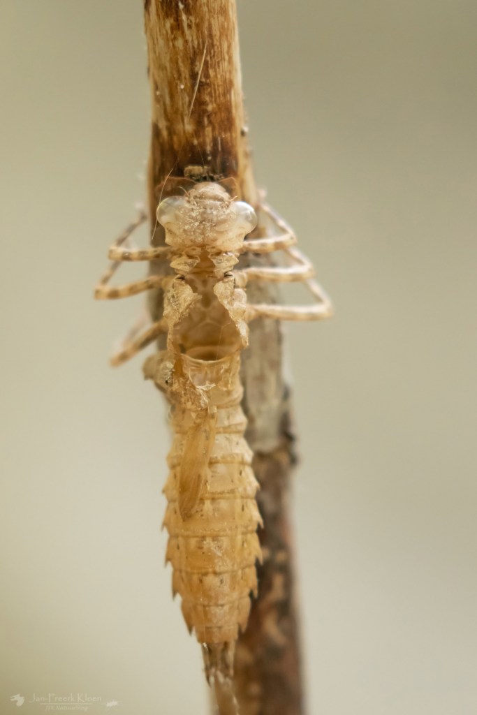 Toen de slang even uit beeld verdween, stak ik wat tijd in het fotograferen van de schemerlibel. Hij zit er veel, maar is lastig vast te leggen omdat hij snel vliegt, een goede schutkleur heeft en het liefst in de donkerste delen langs de rivier vliegt. Ik vond er eentje met een relatief kort vast rondje en bleef minutenlang in de rivier staan. Elke keer dat hij langs kwam klikte ik erop los. Een paar luckyshots voldoen, maar het kan mooier. Al twijfel ik daar bij deze soort aan.