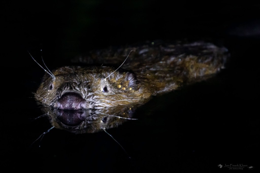 Niet veel later kwam een andere bever vanaf het eiland naar mijn kant lopen en ging het water in. Kansloos dacht ik, een bewegend object in het pikkedonker kan nooit een mooie foto worden. Maar de bever vond vooral mij interessant en kwam steeds dichterbij. Op een meter of vijf van mij vandaan bleef hij roerloos in het water liggen staren. Ik zette mijn camera neer, lamp aan en klikken. De bever keek me aan en liet het gebeuren. Mijn lamp was eerder weer uit dan dat de bever vertrok. Het moment duurde minutenlang. Al die tijd keek ik ademloos naar die krokodil die in het water naar me loerde. Na een tijdje zwom hij weg en trok zijn boeggolf verder de wijk in. Wauw!