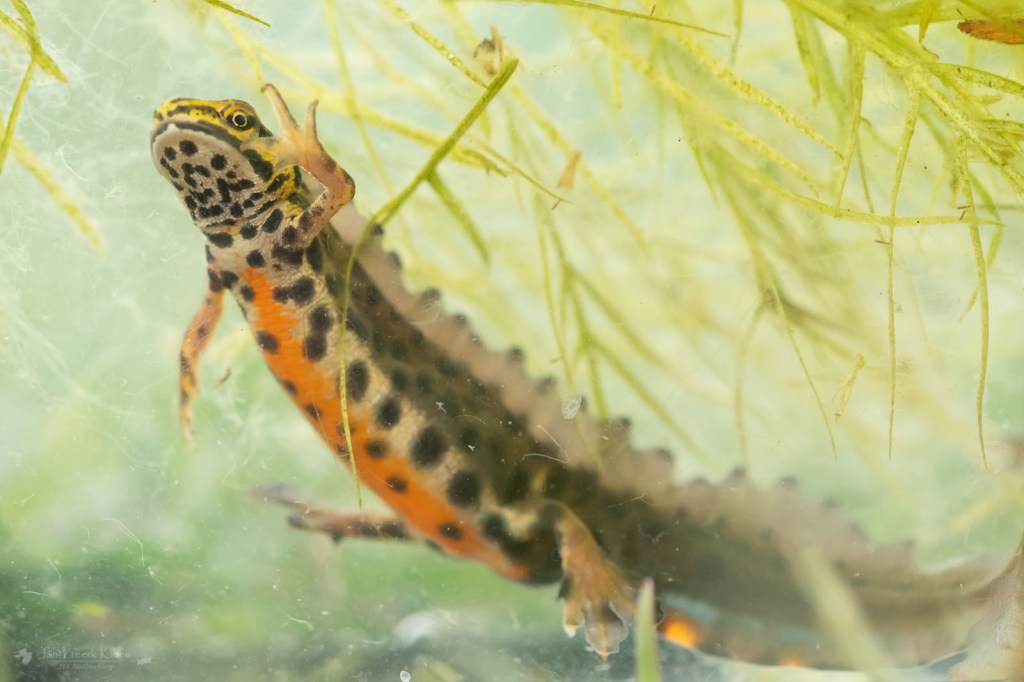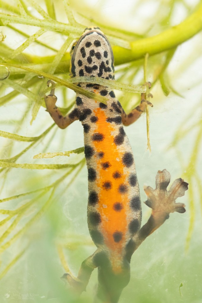 Het is dus niet zo makkelijk om dit te zien te krijgen, maar als je ’s avonds met een zaklamp in een vijver in het water schijnt kan je er misschien een glimp van opvangen. Dan zijn de salamanders het meest actief en heb je bovendien geen last van de weerspiegeling van de lucht op het wateroppervlak als je onder water probeert te kijken. De buik zal je dan niet zien, maar de rugvin en staart misschien wel. En voor nu: geniet van de foto’s!