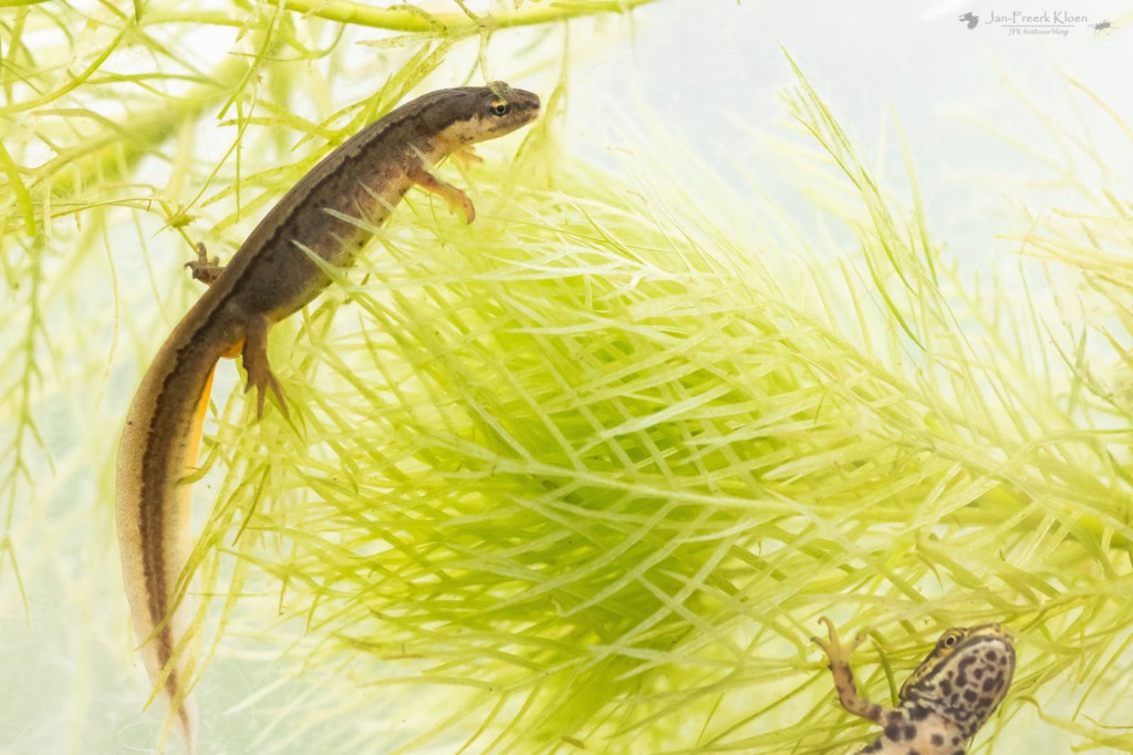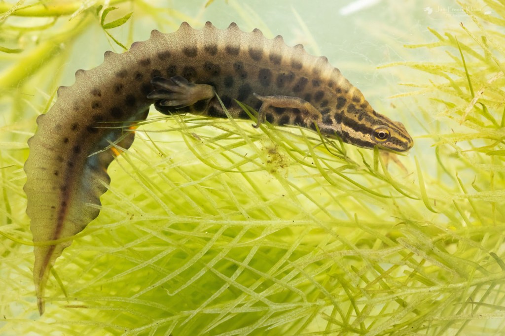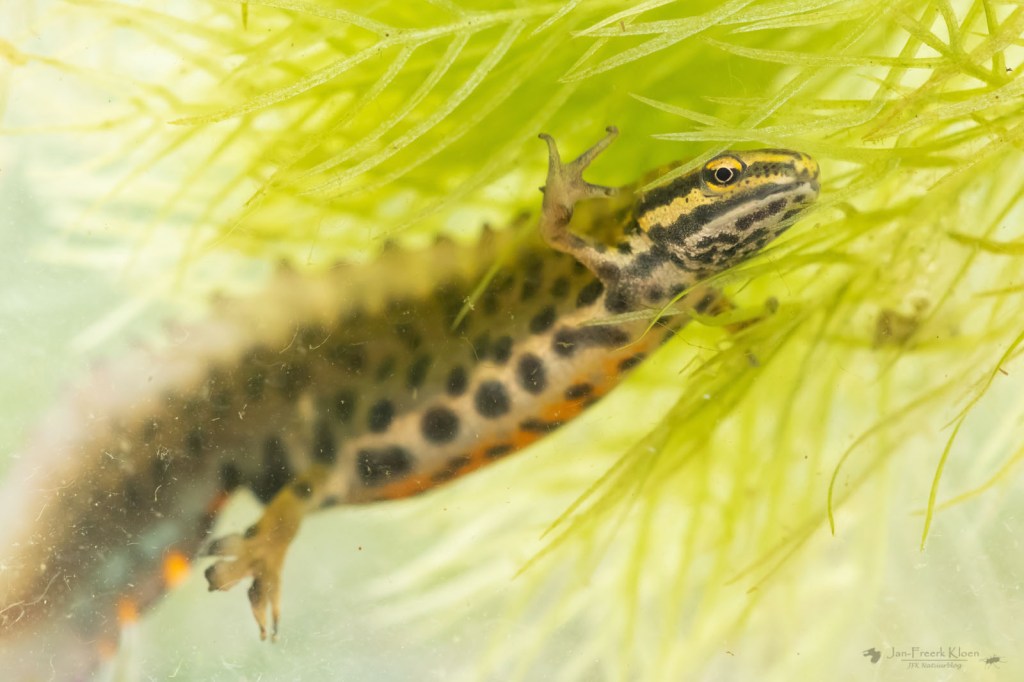 Twee weken geleden heb ik daar met een net amfibieën gevangen. De mooiste vangst was zeker niet zeldzaam, maar wel zeldzaam mooi. Het mannetje van de kleine watersalamander is in deze tijd van het jaar extra opgepimpt om indruk te maken op de vrouwtjes. De gevlekte buik is knaloranje, hij heeft een prachtige kam op zijn rug en een sierlijke staart met mooie gekleurde accenten. Als kers op de taart heeft hij ook nog mooie franjes aan zijn achtertenen, een beetje als een vinpootsalamander, die dat nog veel sterker heeft.