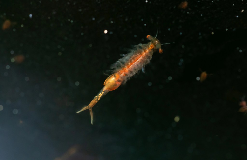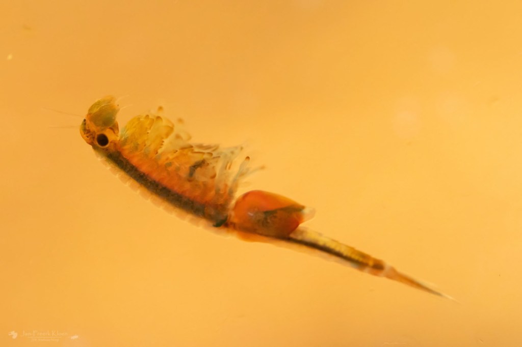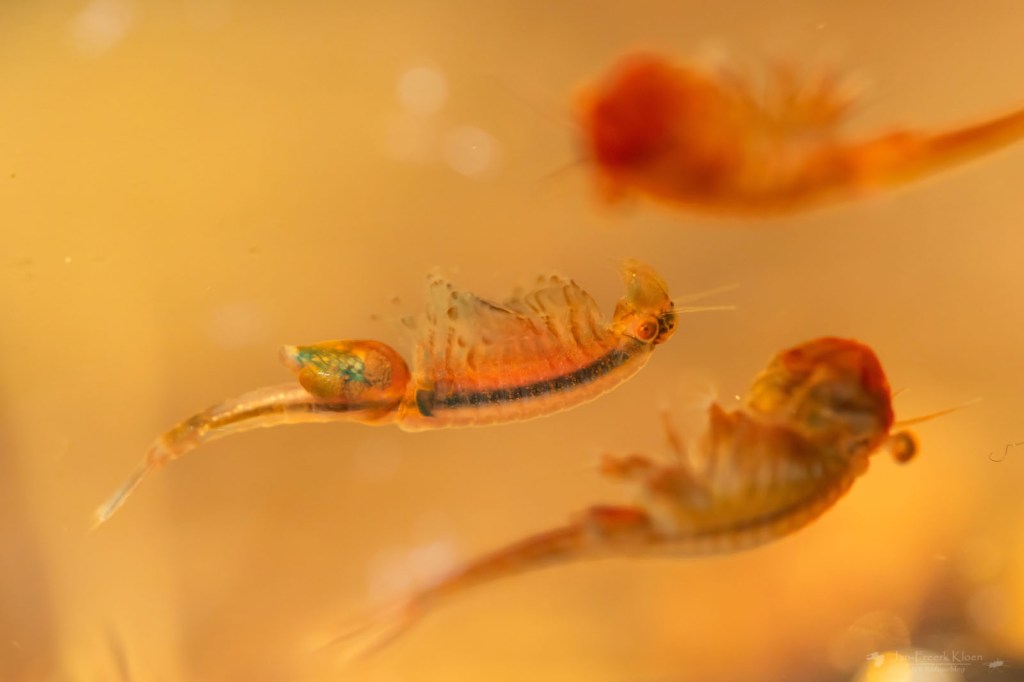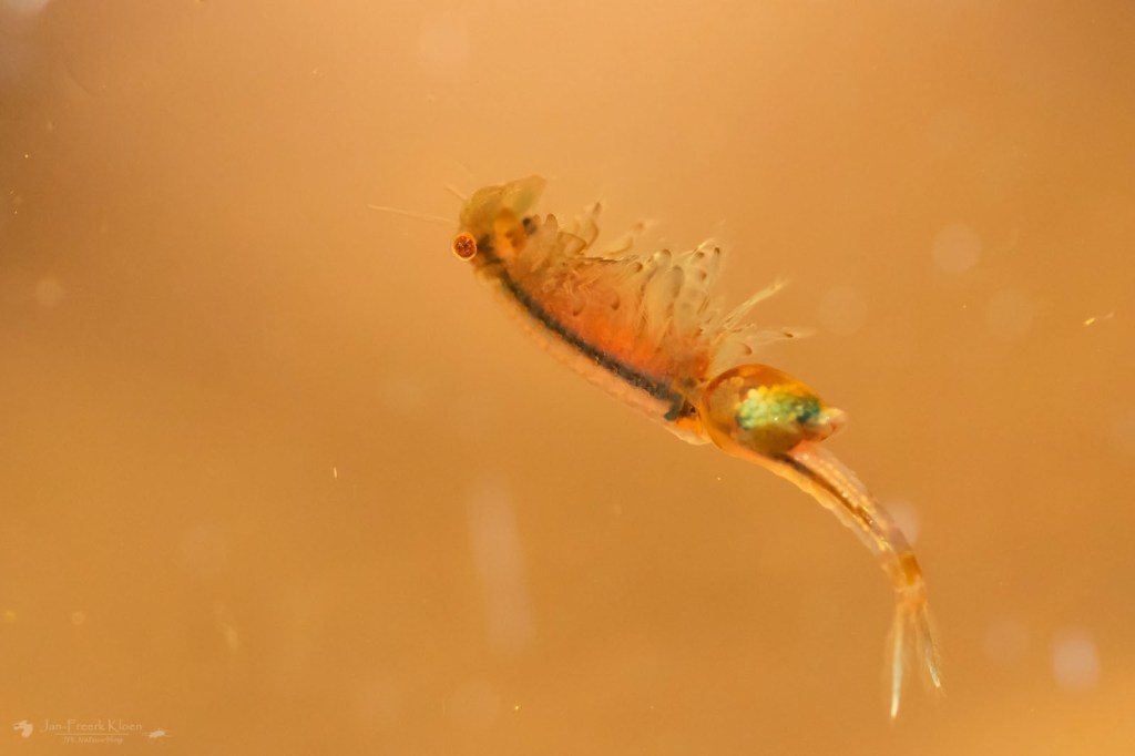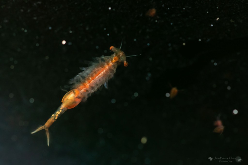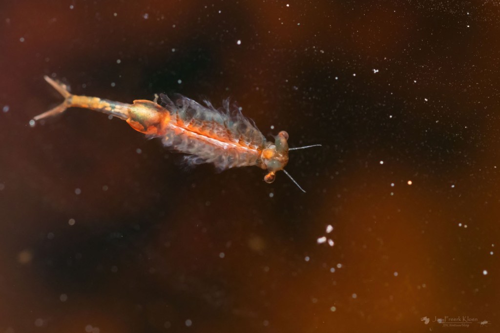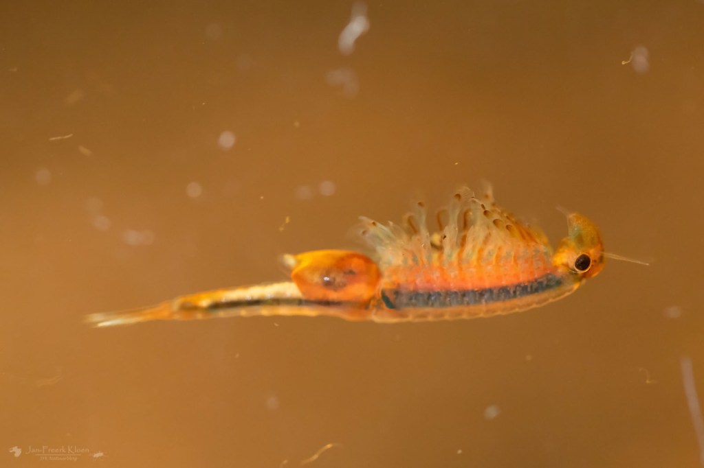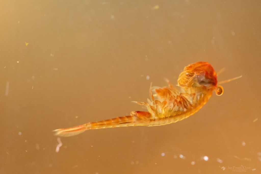 Ik was erop gebrand het diertje te vinden we schenen laat in het seizoen te zijn, dus terwijl iedereen nog met de fietsen bezig was liep ik al naar het water. Ik keek naar beneden, zag gelijk twee rare wezentjes zwemmen en schepte ze op. “Ik heb ze!” – terwijl ik snel mijn cuvet uit mijn tas haalde. En daar waren ze dan: de meest bizarre en beestjes die ik ooit heb gezien. Van ze zijkant prachtige kleine oranje kreeftjes, met kleine tentakeltjes waarmee ze zich ondersteboven voortbewegen. Veel vrouwtjes droegen eiklompen bij zich.