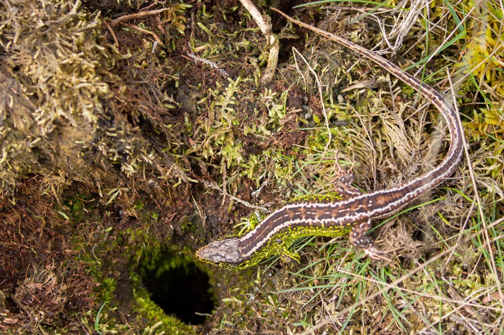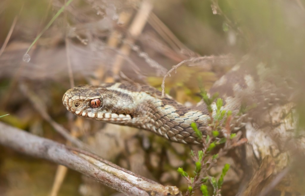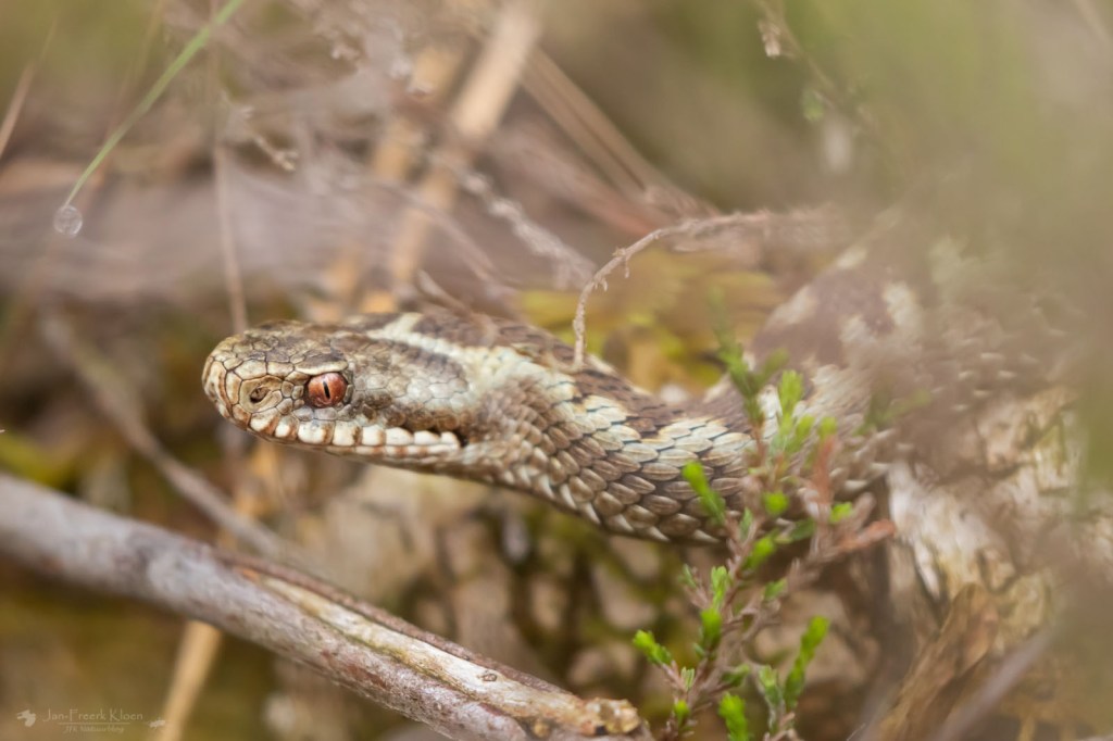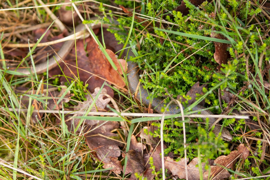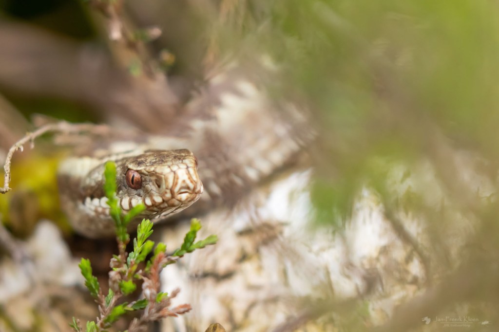 We telden op de eerste route (dezelfde als de vorige toptelling) maar liefst anderhalf keer zoveel zandhagedissen als de vorige keer: 36. Dat zijn aantallen die we al een tijd niet meer gehaald hebben. Bovendien vond ik een flinke addervrouw, een soort waarmee het heel slecht gaat op de Veluwe. Op deze route dachten we vorig jaar de laatste adder gezien te hebben toen we voor het tweede jaar op rij één en hetzelfde vrouwtje zagen. Dit was echter een andere en op een andere plek, dus dat is een (heel bescheiden) lichtpuntje. Nog mooier was dat ze zich fantastisch liet zien. Kort daarna blunderden we tegen een draaihals aan (niet op de foto helaas) en de telling werd nog aangevuld door twee hazelwormen.