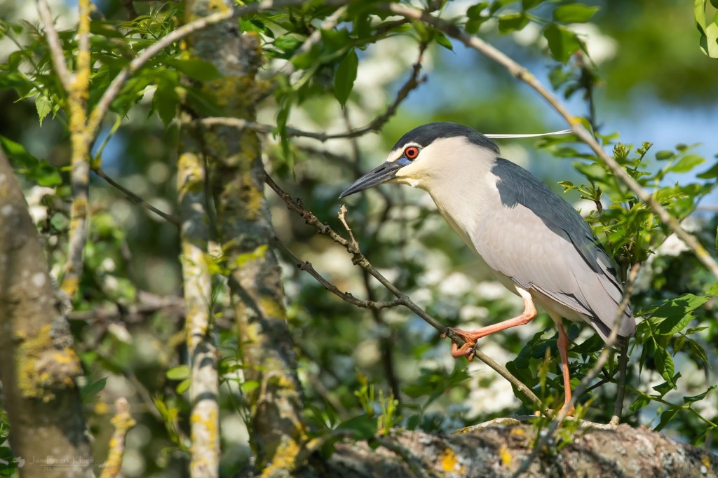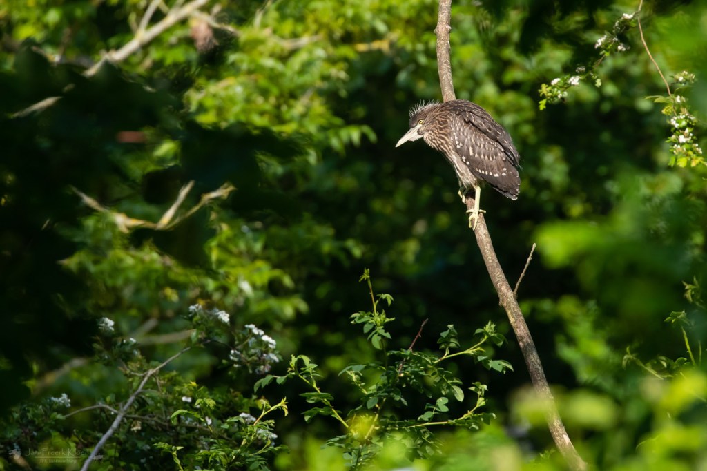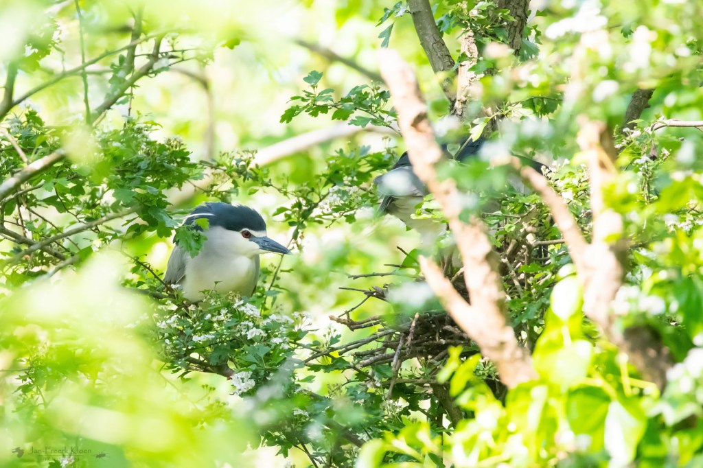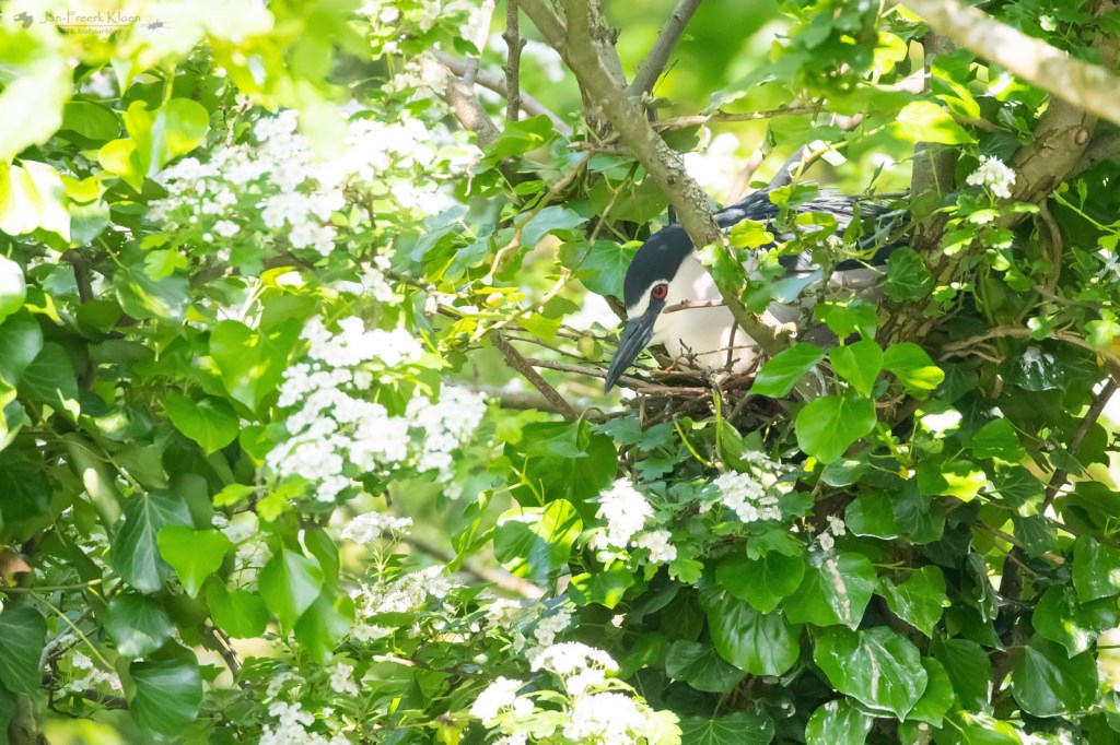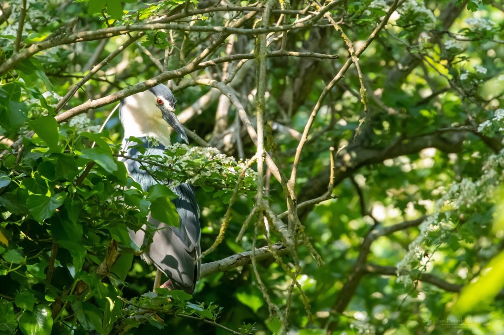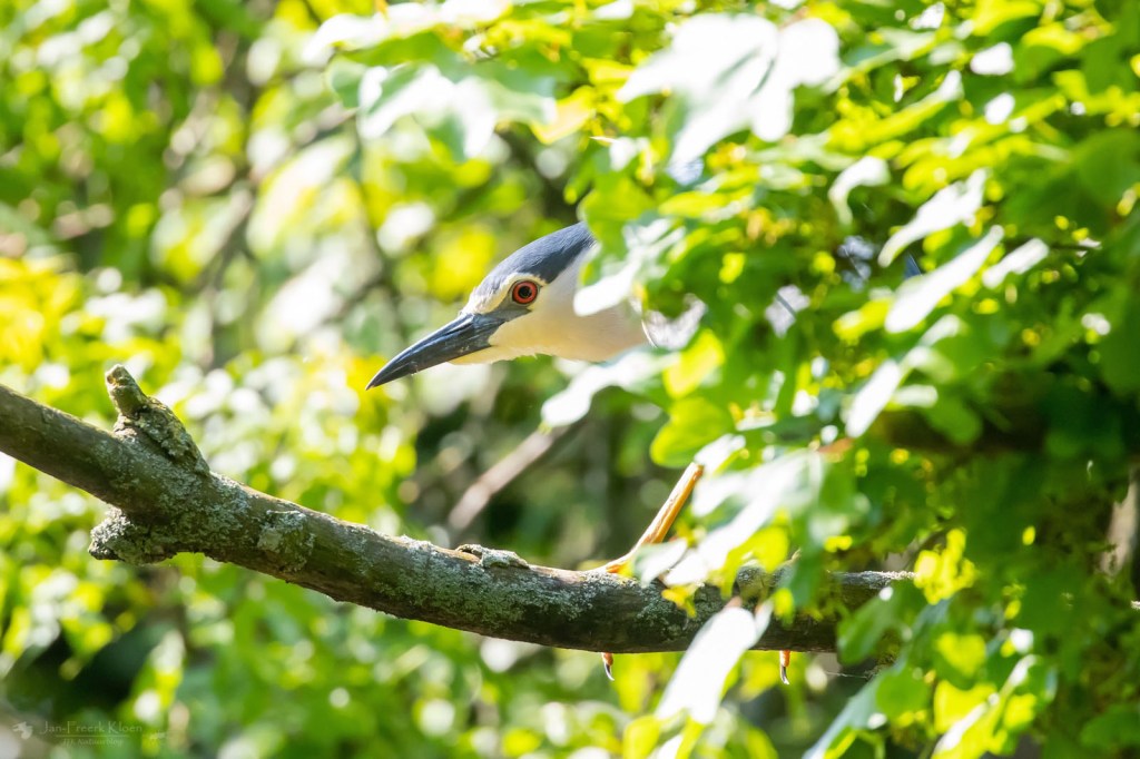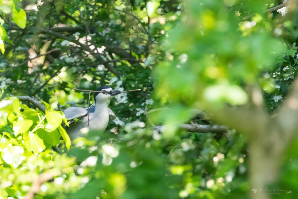 De kolonie zit gewoon in een park aan de rand van de stad. Op een eilandje, buiten bereik van vervelende mensen. Dat wel. We moesten even zoeken, maar toen zag ik de eerste kwak. Ik zag net een stukje verenkleed tussen de takken door. Best dichtbij in een overhangende tak boven het water. Ik stapte een stukje opzij om hem beter te kunnen zien, de kwak keek om het hoekje, zag mij en was gelijk weg.
